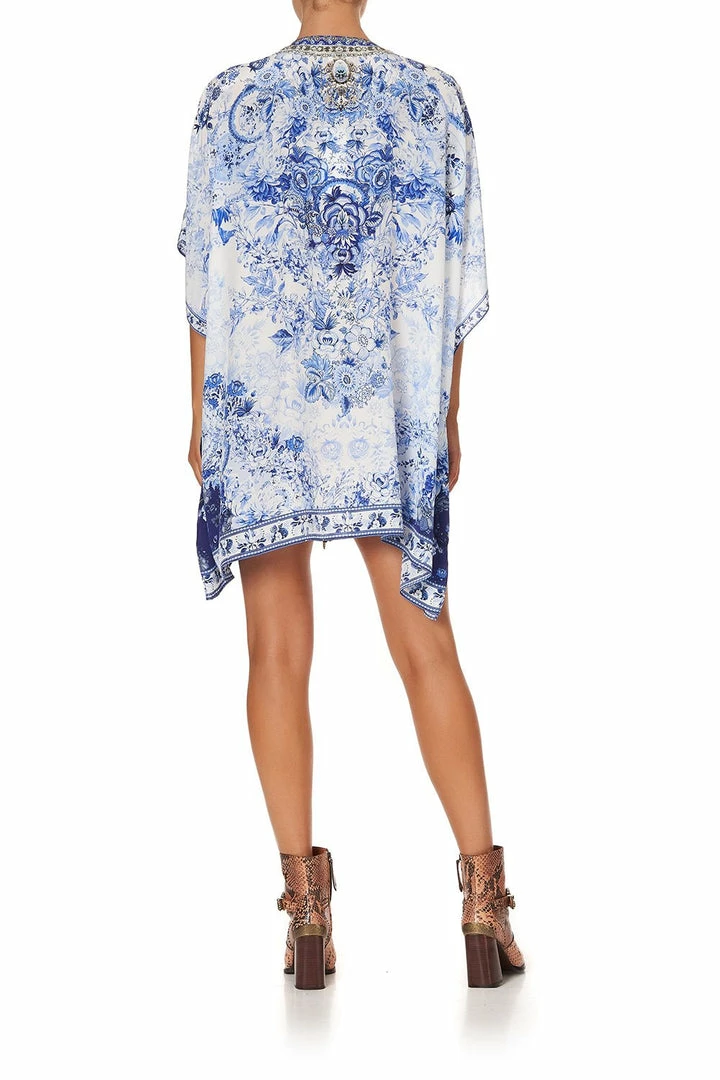 A signature CAMILLA silhouette, the High Tea Short Lace Up Kaftan is reimagined with the travel treasures collected from English tea rooms and antique market stalls. Reminiscent of aristocratic ceramics, a canvas of china white pure silk is delicately adorned with vintage blue florals and hand-placed CAMILLA crystals, inspired by a duchess with a taste for the finer things. Cut in a short length, this resort wear classic is finished with a lace-up neckline and 3/4 length sleeves. Effortlessly versatile, this silk kaftan can be worn as a mini dress or tucked into the front of trousers to give a draped blouse look.