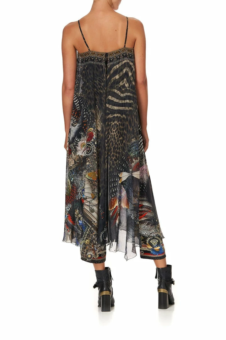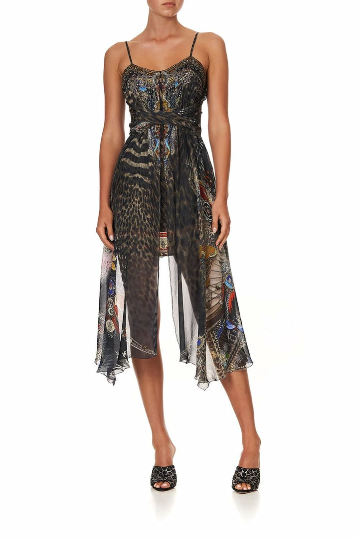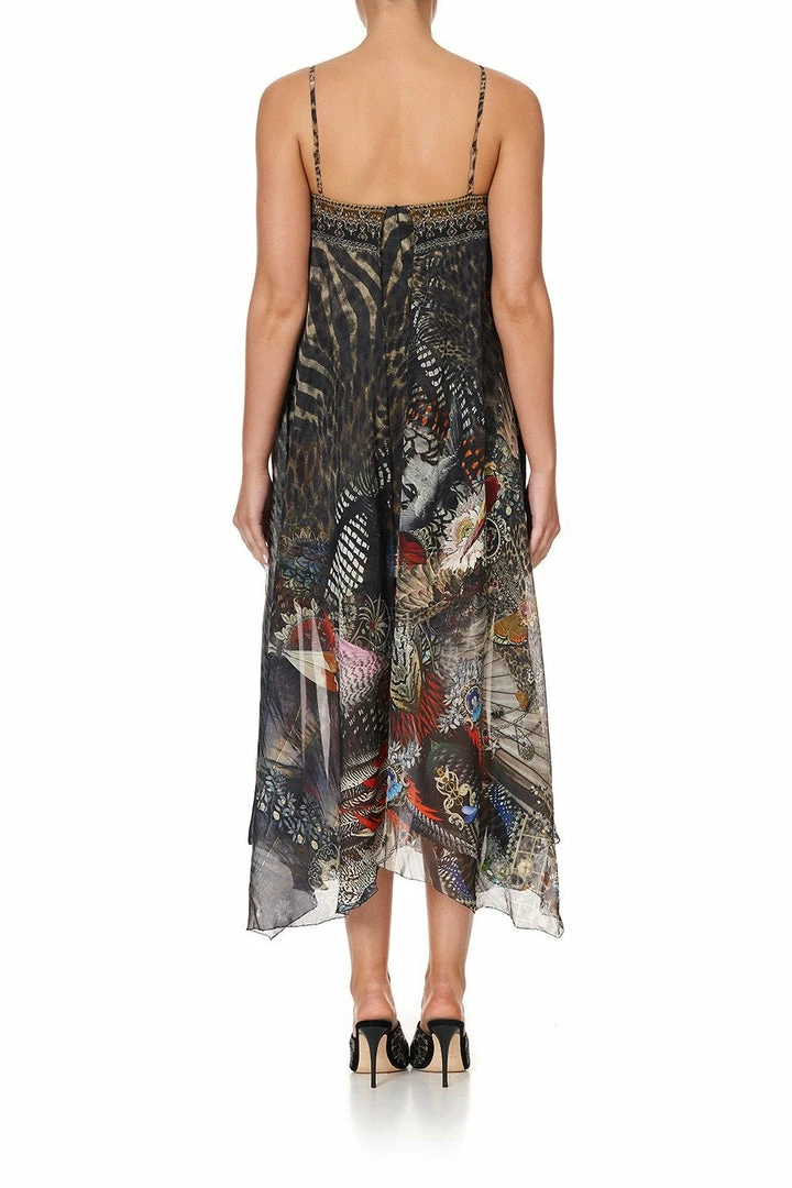 Enchanted with a divine freedom of movement, the Treasure Chaser Short Layered Dress is a mini-length party dress with a free-flowing sheer overlay, crafted in an ethereal hanky hem midi-length. Delicate spaghetti straps frame the CAMILLA crystal embellished neckline that gives way to an elegantly reflexed fit. Crafted from pure CAMILLA silk, a luxurious melody of animal prints is accented with vibrant butterfly and bird motifs as a subtle nod to our rock-and-roll starlet muse. Embrace the easy movement of this silk dress and style with heels for a night free of inhibitions and starlit dancing.