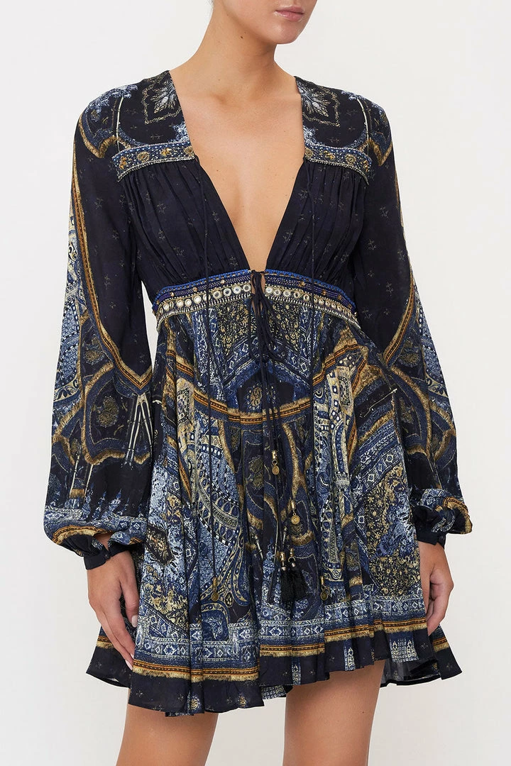 Effortlessly romantic with exquisite intricacies, the Forever Family Short Peasant Dress captivates our gaze with a deep navy hue as ornate golden details arch their way around mosaics of ethereal amulets. Hand-embellished with signature CAMILLA crystals, this luxury dress plays host to a deep v neckline, statement blouson sleeves, a contrast waistband and a relaxed silhouette that falls into a billowy flared hemline.