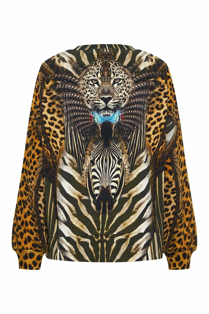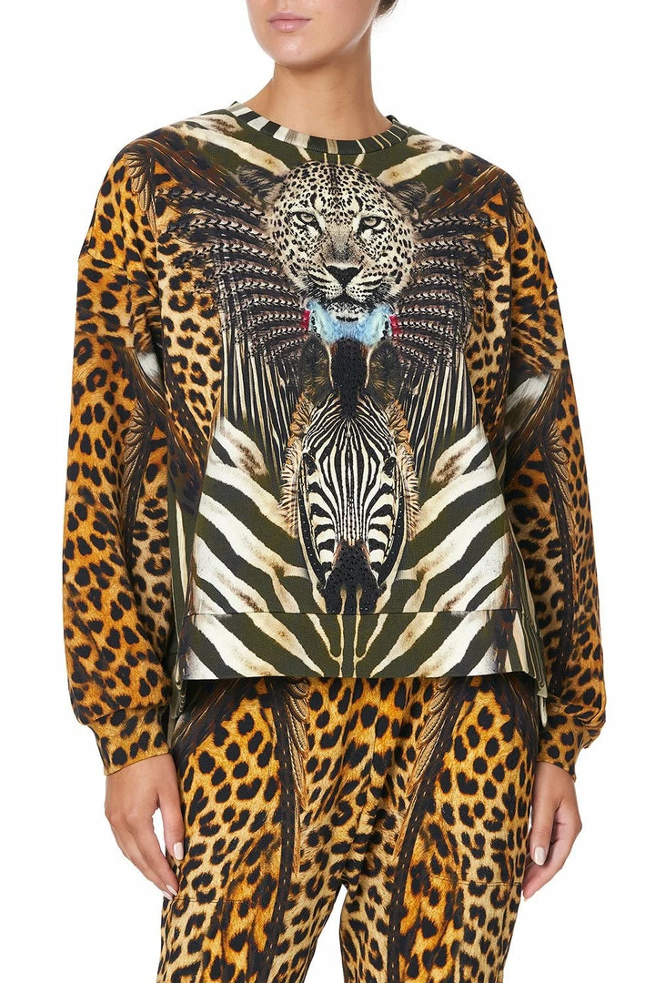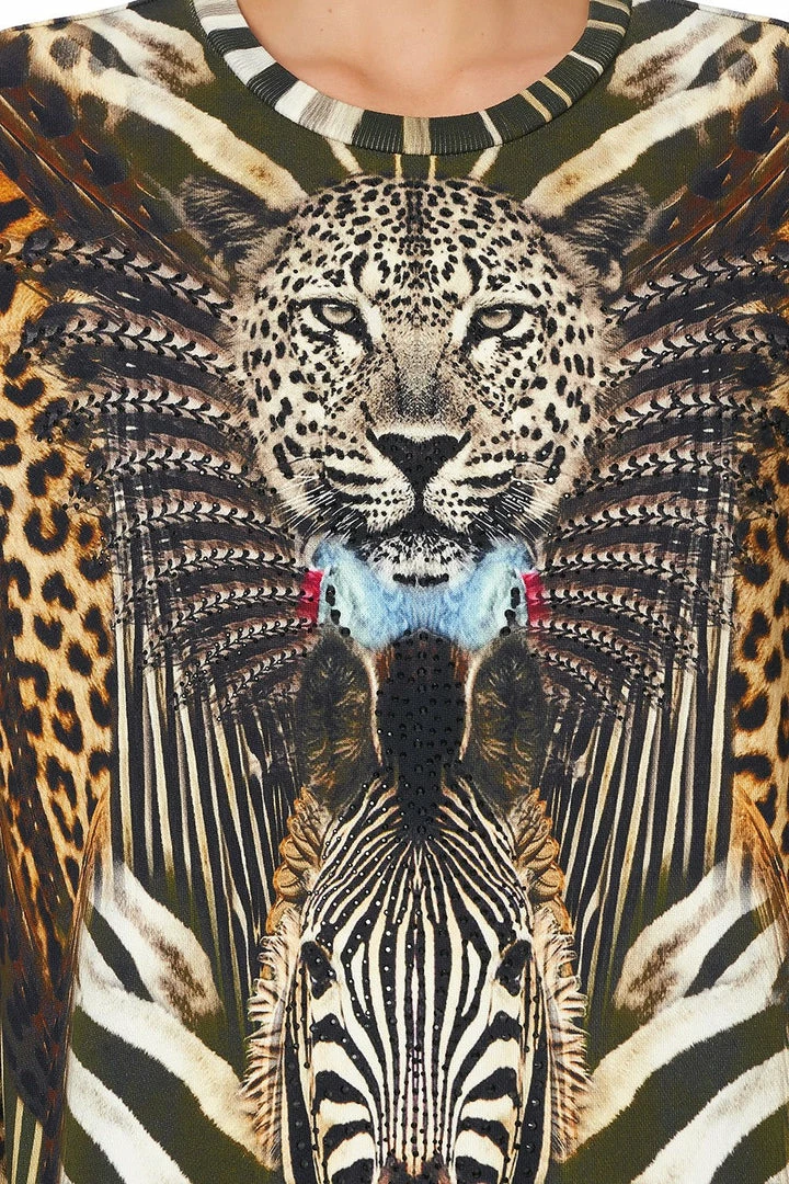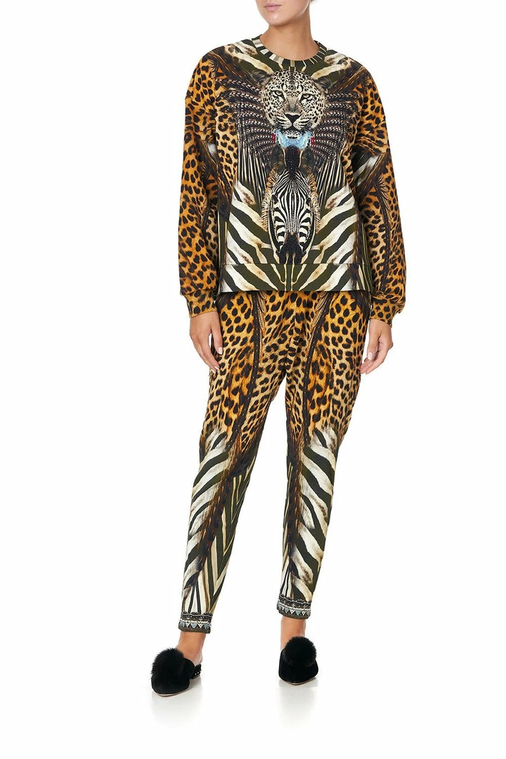 Casual and comfortable, the Nine Lives Short Relaxed Sweater is crafted from pure cotton and printed with a luxe khaki print with golden and animal accents in a nod to Camilla’s past travel journey. This crew neck jumper glistens with hand-embellished CAMILLA crystals and is cut in an easy fit with ribbed cuff details. Complement with the matching Nine Lives Rib Waist Relaxed Pant.