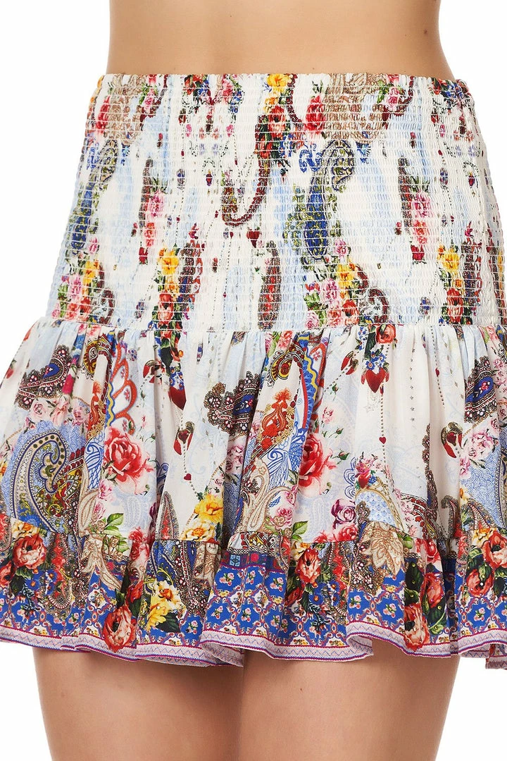 A classic CAMILLA piece reimagined with the bold hues of feminine beauty, the Frida Freedom Short Shirred Skirt pays homage to Frida and her passion for Mexico and its deep rooted culture coming out through her soul. An intricate print lost in blue and red paisley, this lavish high waisted mini skirt features a flattering shirred waistband that smooths the form, flirty ruffle hem, digitally printed silk, as well as hand-placed crystals as detail. Pair back with matching cami for an elevated resort ensemble.