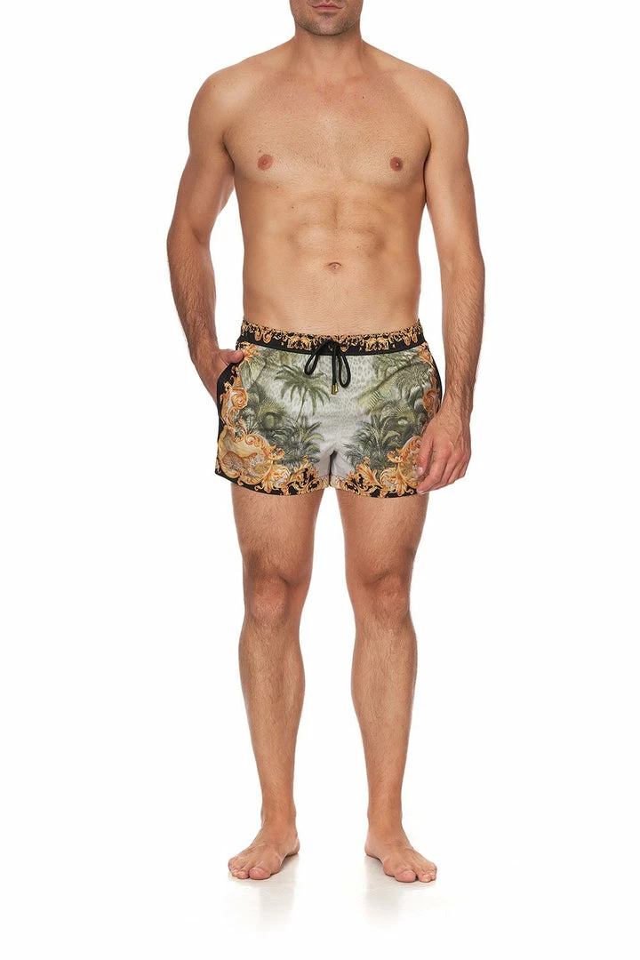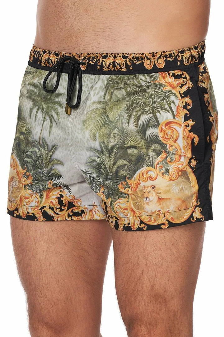 Opt for a cheeky crop in our soft green Palazzo Of Palms Short Swim Short. Oozing extravagance, inspiration calls from the elegance that defined the naughty nineties. A subtle pistachio hue weaves its way across ferns and tropic palms alongside opulent golden architecture that lines the trim. These luxury swim shorts feature an elasticated drawstring waist for your most perfect fit, a contrasting black edging, a fitted silhouette and a cropped length.