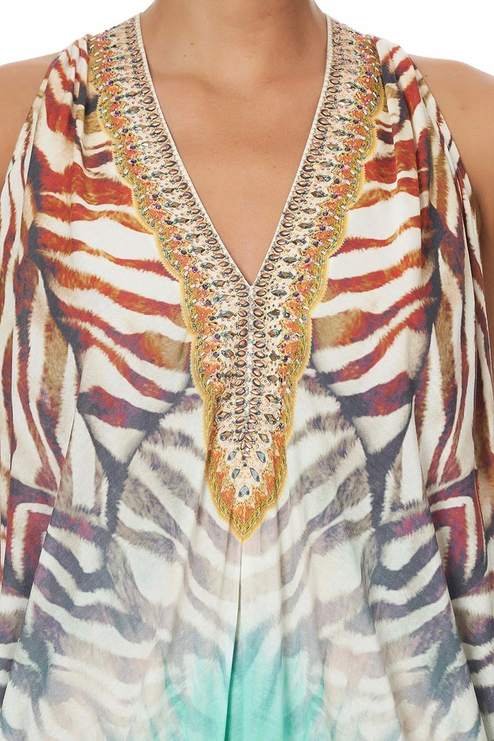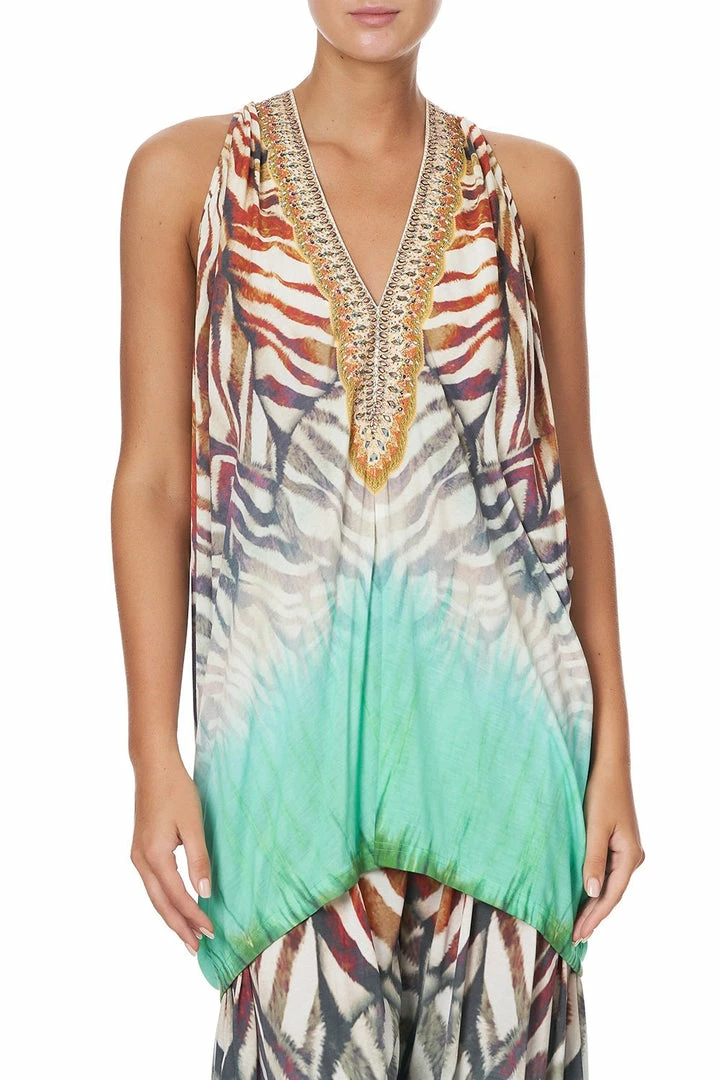 Effortlessly draped, the Savannah Side Cowl Top is an ode to the reigning majesties who roam our decadent Mother Earth with untamed spirit. Crafted to complement sun-kissed skin, vibrantly green grasslands take centre stage as they blend into earthy zebra stripes and signature crystal adornments. This statement summer blouse sports a draped detail upon silhouette, a relaxed fabrication and a deep sleeveless cut. Style with the Jersey Drape Pant With Pocket to complete the look.