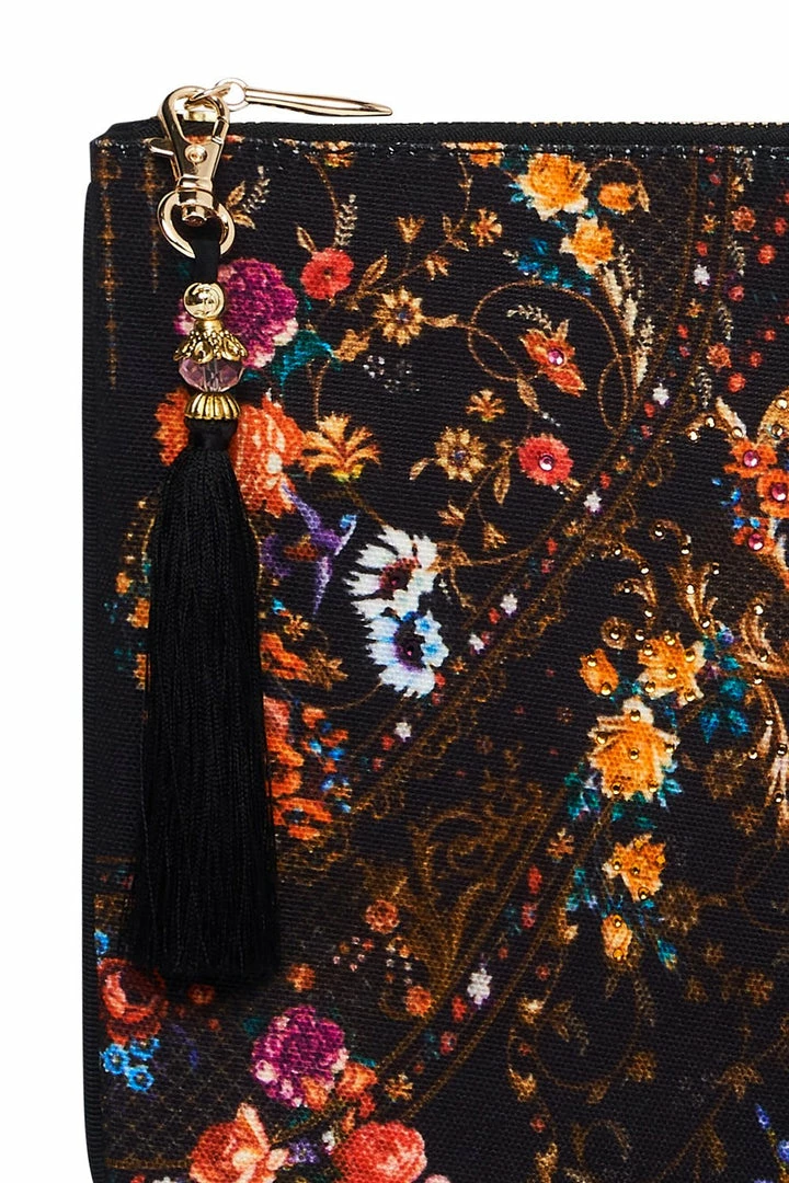 A bouquet of bright florals adorns the Blushing Manor Small Canvas Clutch, beautifully contrasting with the black canvas base. Inspired by a wild English rose enchanted by nightfall, this mesmerising purse is finished with a black tassel parrot clip and hand-placed CAMILLA crystal embellishment. Crafted with two internal zip pockets, this small clutch bag is the ideal size for carrying your cards and phone. A striking gift for a loved one or add to your collection of iconic CAMILLA accessories.