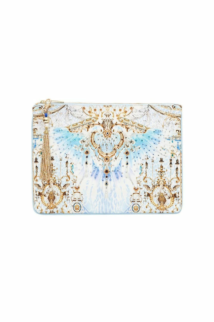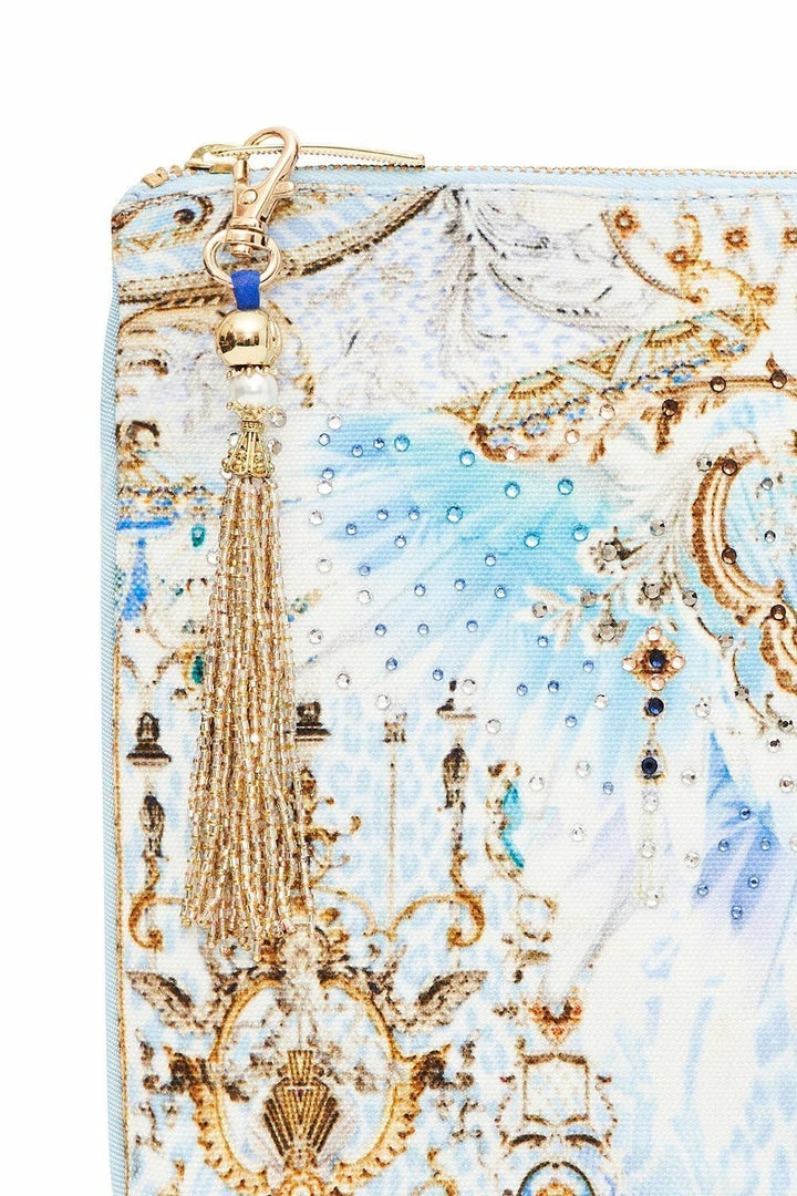 A concoction of blue hues, the Gatsbys Girl Small Canvas Clutch takes on the age of Gatsby. In a blend of animal print and soft feather details, this compact clutch hosts a two-compartment interior to fit your most valued possessions on the go. Crystal embellishment detailing ties the canvas together to take you from day to night.