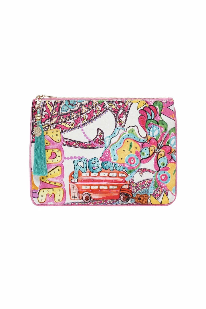A peaceful canvas protest, the Let The Sun Shine Small Canvas Clutch lets the world know you are a child of the revolution. Embody a summer of love spirit and pair this neon purse with matching hippie prints. Featuring two internal zip compartments and tassel zip closure, this keepsake accessory will transport you straight to the Age of Aquarius. Spread the word and gift to a freewheeling friend.
