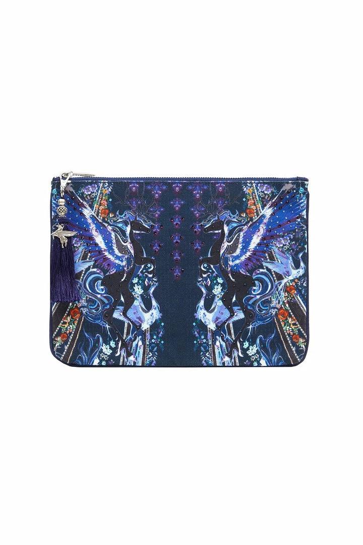 Whimsical and mesmerising hand painted folklore, the Mare Mystique Small Canvas Clutch is a lush deep blue clutch, crafted in a print inspired Hungarian Fairy Tale John Valiant. This clutch features a boho swing tassel, a parrot clip, an internal zip pocket and finished with hand placed CAMILLA crystal embellishments. A perfect size to fit in everyday essentials or pair to add the finishing touch to your Mare Mystique outfit.