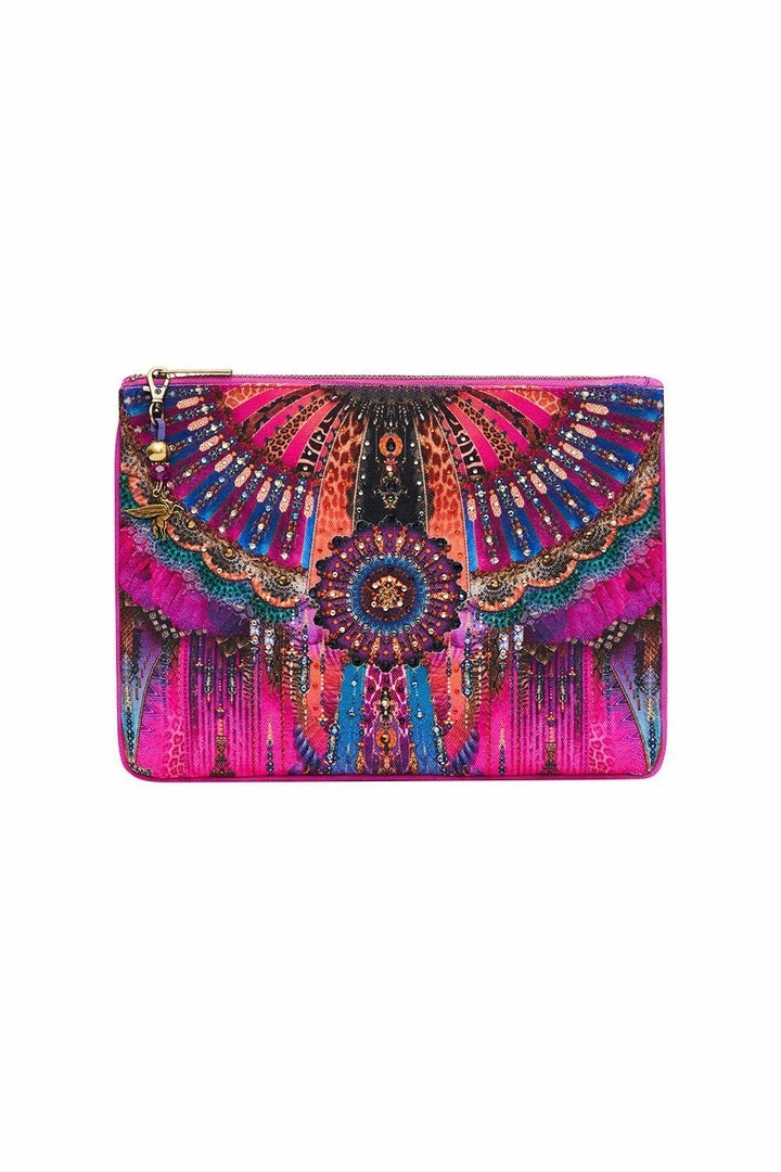 A marriage of Art Deco inspiration and gothic architecture, the Midnight Madness Small Canvas Clutch blends vibrant royal hues with Deco lines. Framed with a piped edge and a parrot clip, complete with CAMILLA charm, this canvas purse has two internal zip pockets, perfect for storing cards, and is big enough to hold your phone. Add to your collection or gift to a loved one as a colourful memento of your shared nights of outrageous adventures.