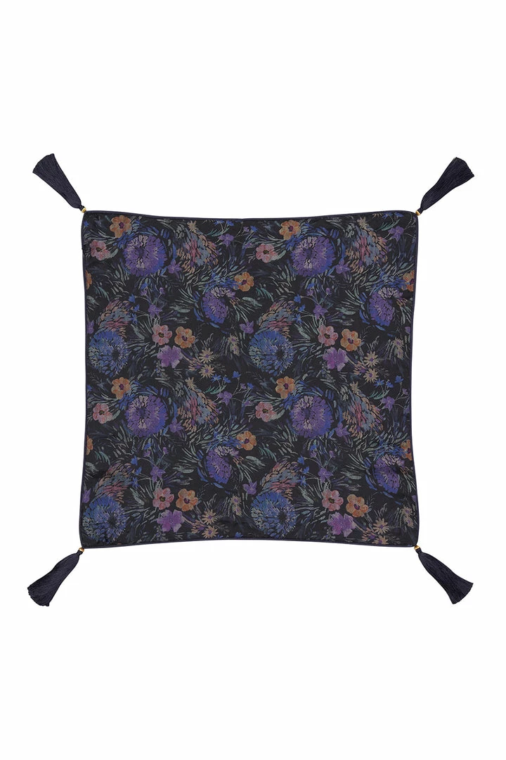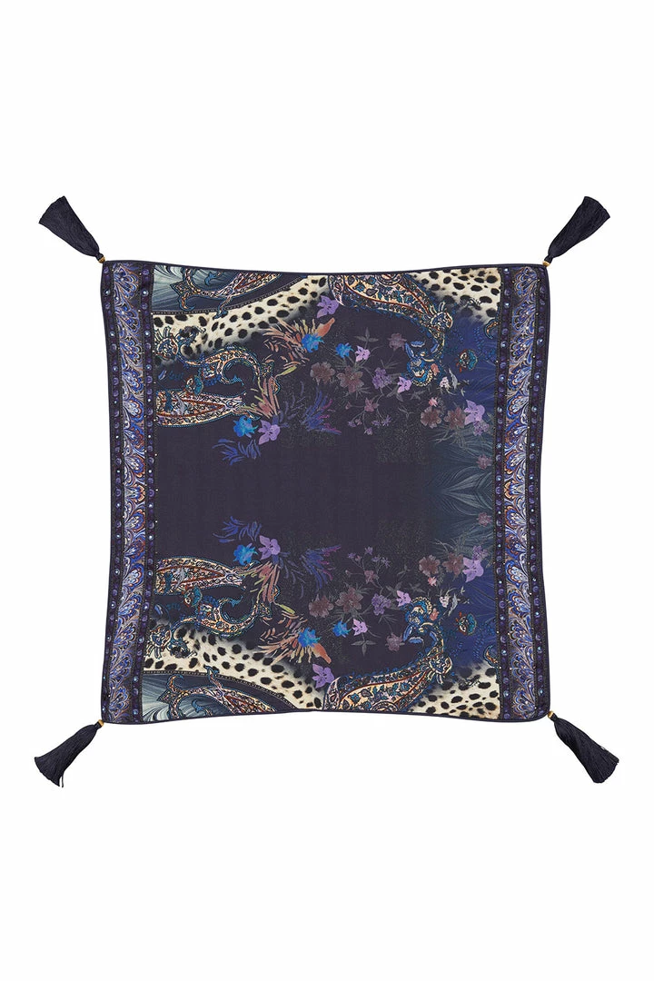 A ravishing statement cushion that glimmers with blue accents and hints of animal print, the Festival Express Small Square Cushion is mused by Janis Joplin and the electrifying music that flows within her. This dazzling cushion is crafted in printed silk that gleams with ornate flourishes across a midnight backdrop. This cushion features digitally printed silk, dual printed sides, a contrast piped edge, corner tassel decoration and hand placed CAMILLA crystal embellishments.
