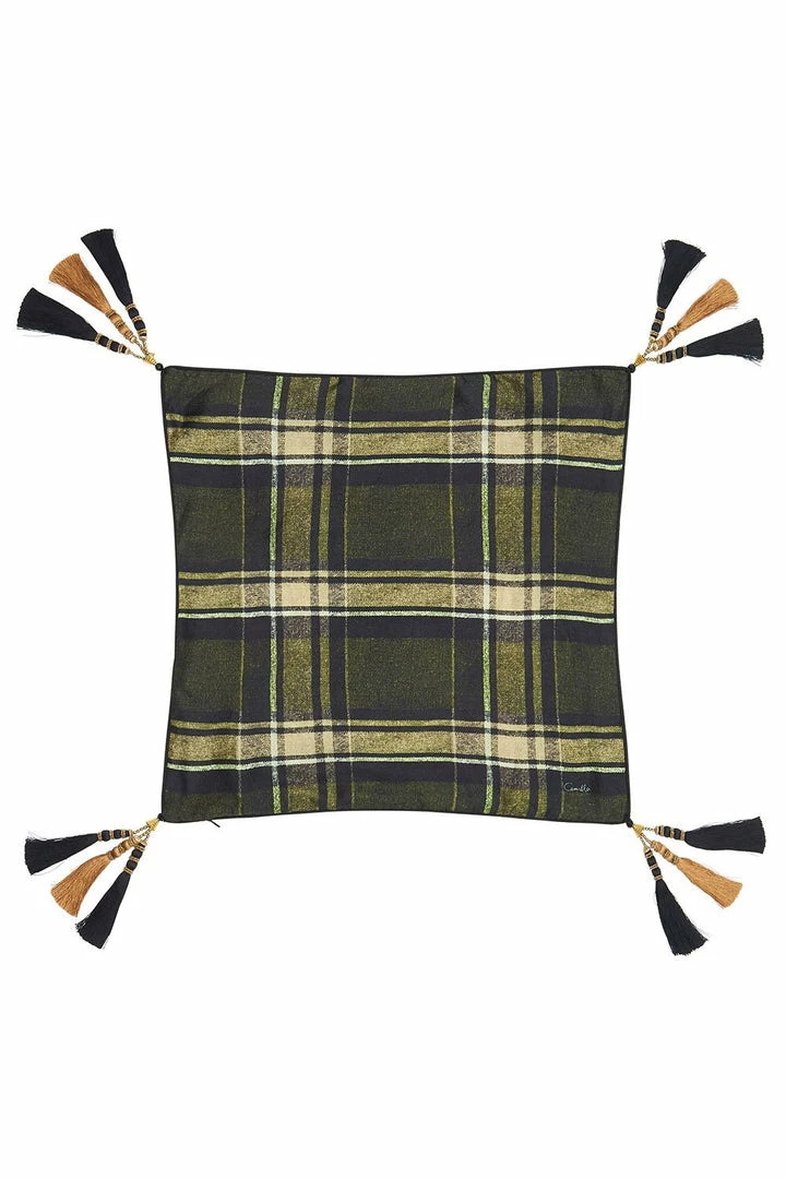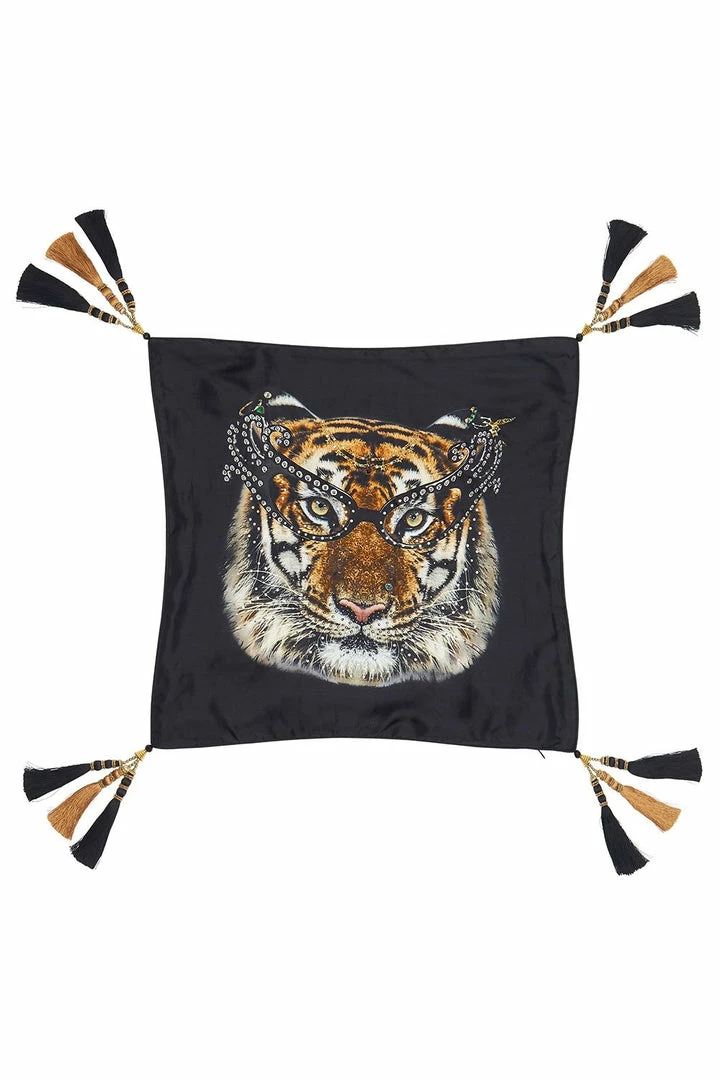 Charmed by the flair of our iconic Dame, the Small Square Cushion proudly exudes personality. This silk pillow boasts tassels on each corner, a playful tiger motif, contrast piped edge, as well as hand-placed crystals as detail.