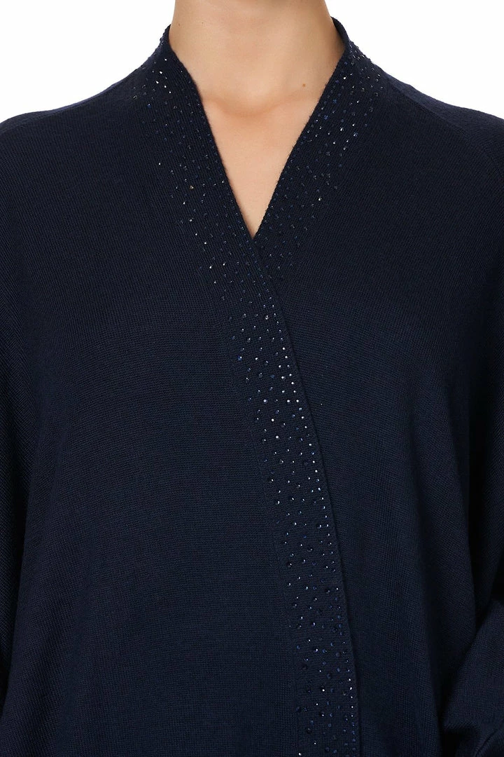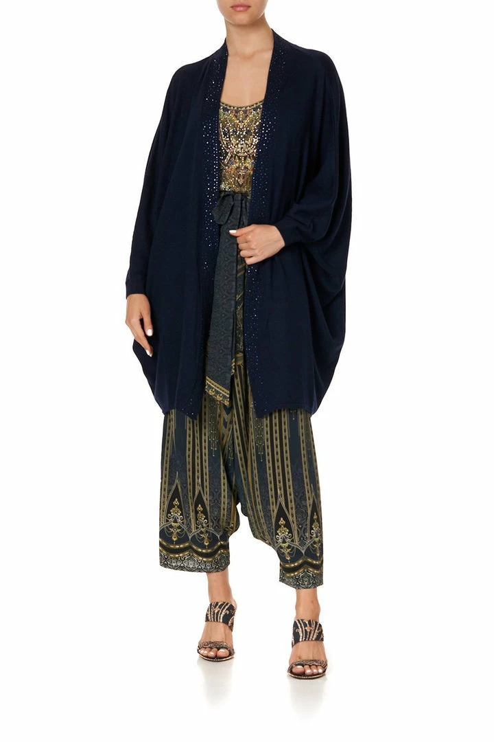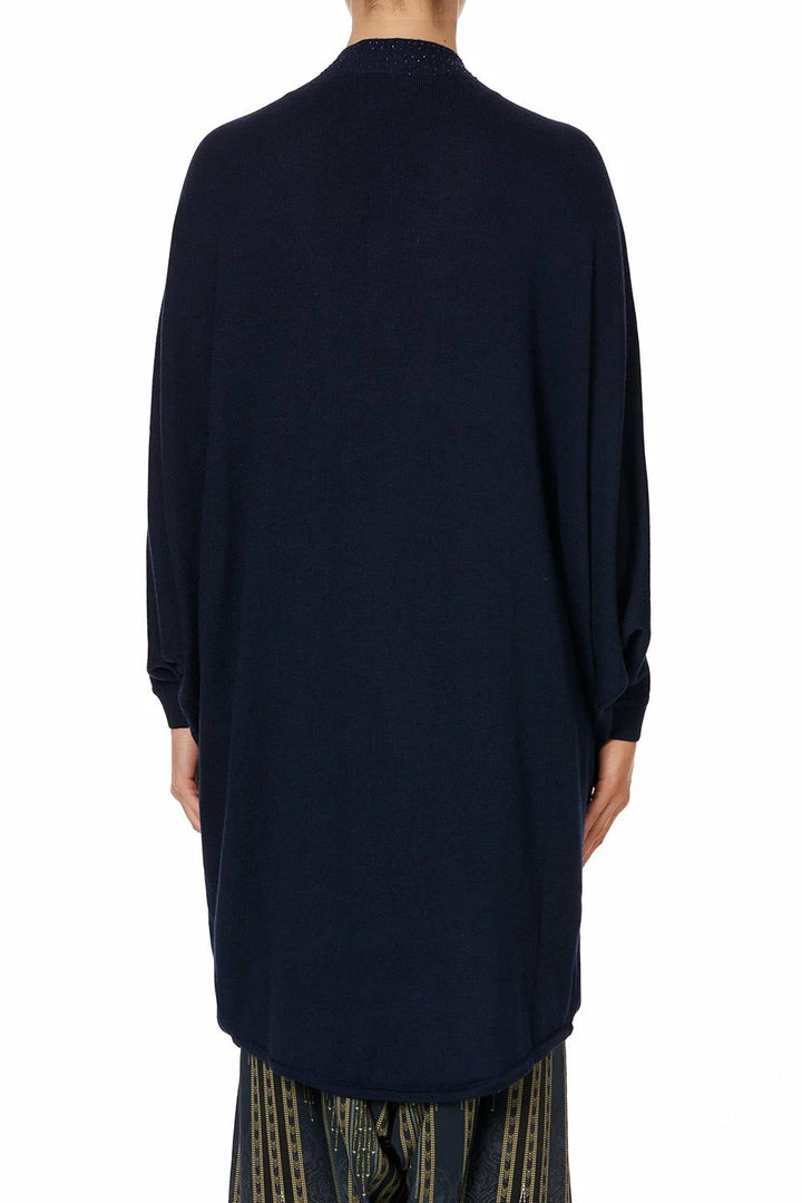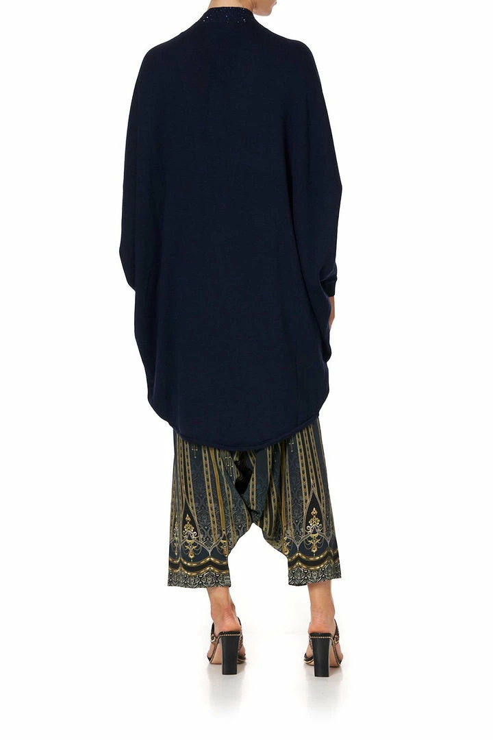 A sumptuously soft layering piece, the Great Scott Soft Knit Poncho With Crystals is a canvas of pure midnight navy Merino wool crafted into an elegant oversized poncho. Finished with a curved hem and framed with a slim neckband decorated with hand-placed CAMILLA crystals, the decadence of this tactile knit is inspired by a jazz filled evening in the roaring 20s. Add this draped design to any style from the Great Scott collection for a luxe layered finish.