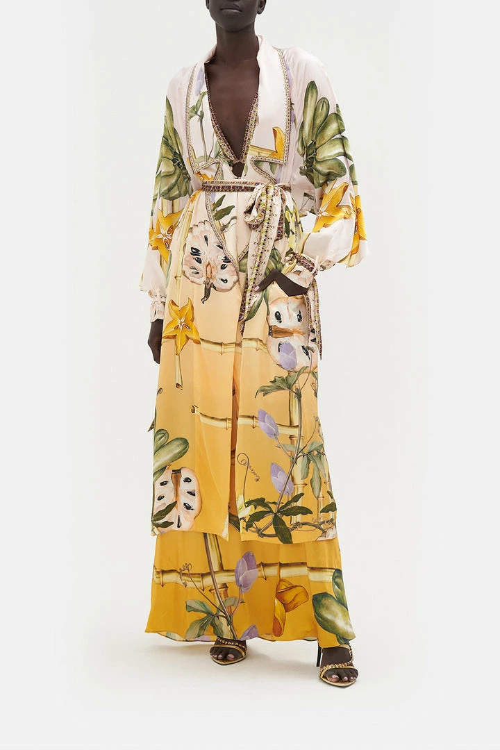 The transeasonal layer steeped in the softness of Pachamama and the timelessness of tailoring, the Original Sin Soft Trench With Ties slips on a soft shade of sunset dipped in statement bamboo panelling, fruits of paradise and cascading vines that intertwine. Crafted from a delicate silk, this luxury trench features ties at the sleeves and waist for added shape and cinch, hand-embellished CAMILLA crystals, statement neck bands, pockets for utter convenience and a relaxed maxi silhouette.