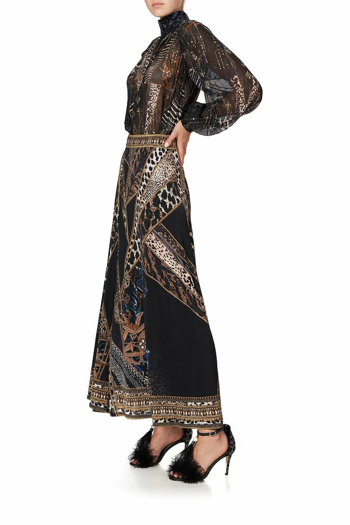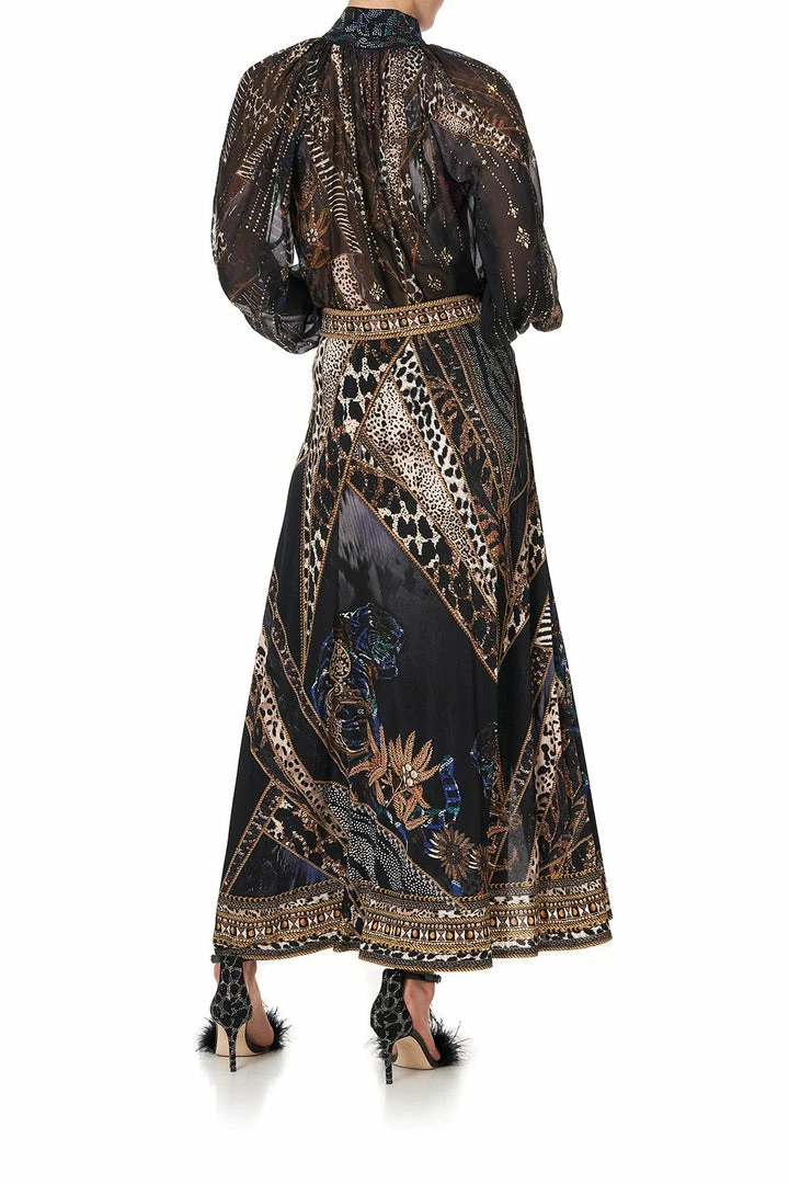 Slip into something on the wild side with our Lady Stardust Split Drape Skirt. An elevated take on casual wear, inspiration calls from the glam rock goddesses who made the lavish eighties their own. A sea of black weaves its way across panels of leopard print, rivers of silver accents and bronzed-hues botanicals. This statement skirt features a high-rise waistband, a wrap-style silhouette that falls into a maxi silhouette and a contrasting panel hemline. Style with the Raglan Button Up Shirt.