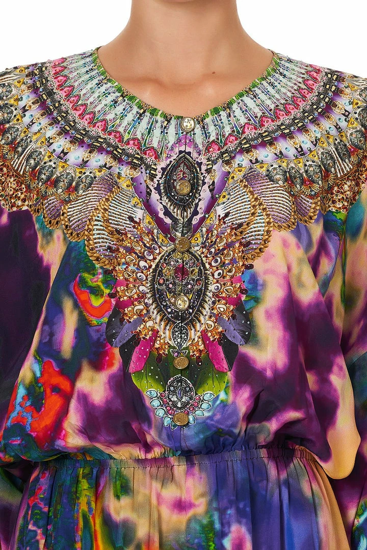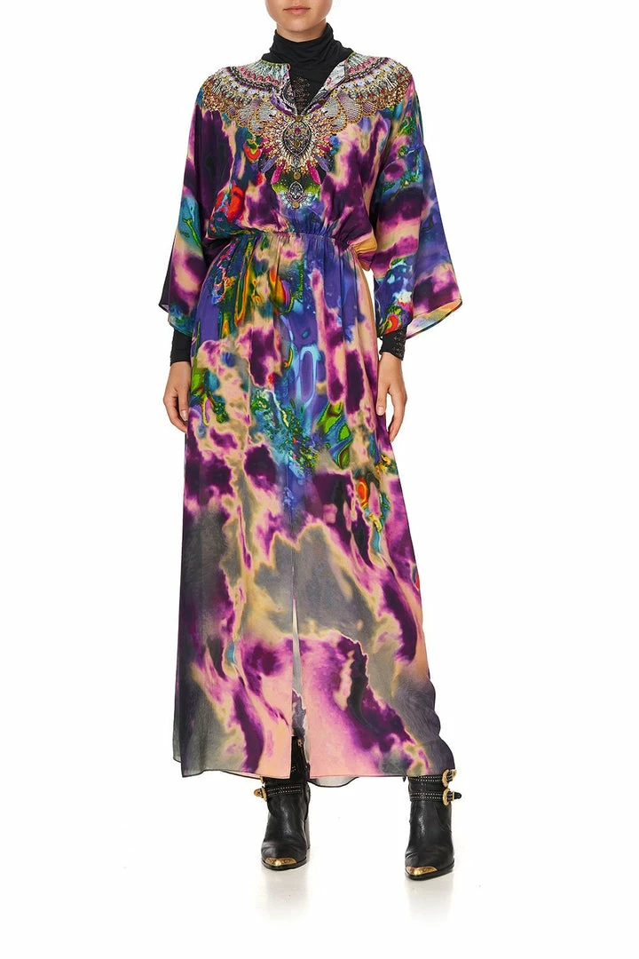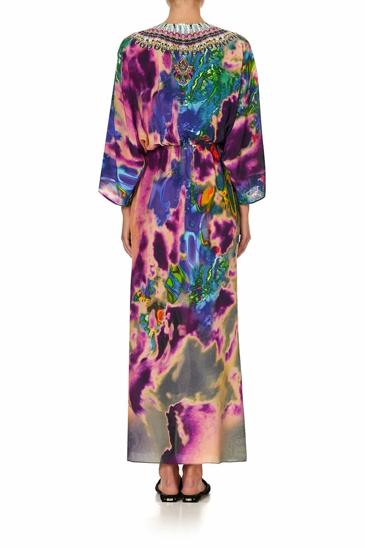 Intoxicated with colour and print, the Acid Abbey Split Pocket Dress depicts the vibrant scenes of a rave unfolding inside the Mad Manor’s greenhouse. Expertly crafted from pure CAMILLA silk, this maxi dress is styled with a hypnotic split front and is finished with a shapely elasticated waist, 3/4 length sleeves and button-down bodice. A scattering of hand-placed crystals sprinkles a final touch of signature magic over this full-length silk dress. Cinch at the waist with a leather belt and wear with either sky high heels or statement sandals.