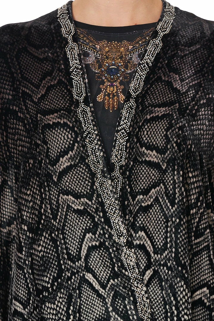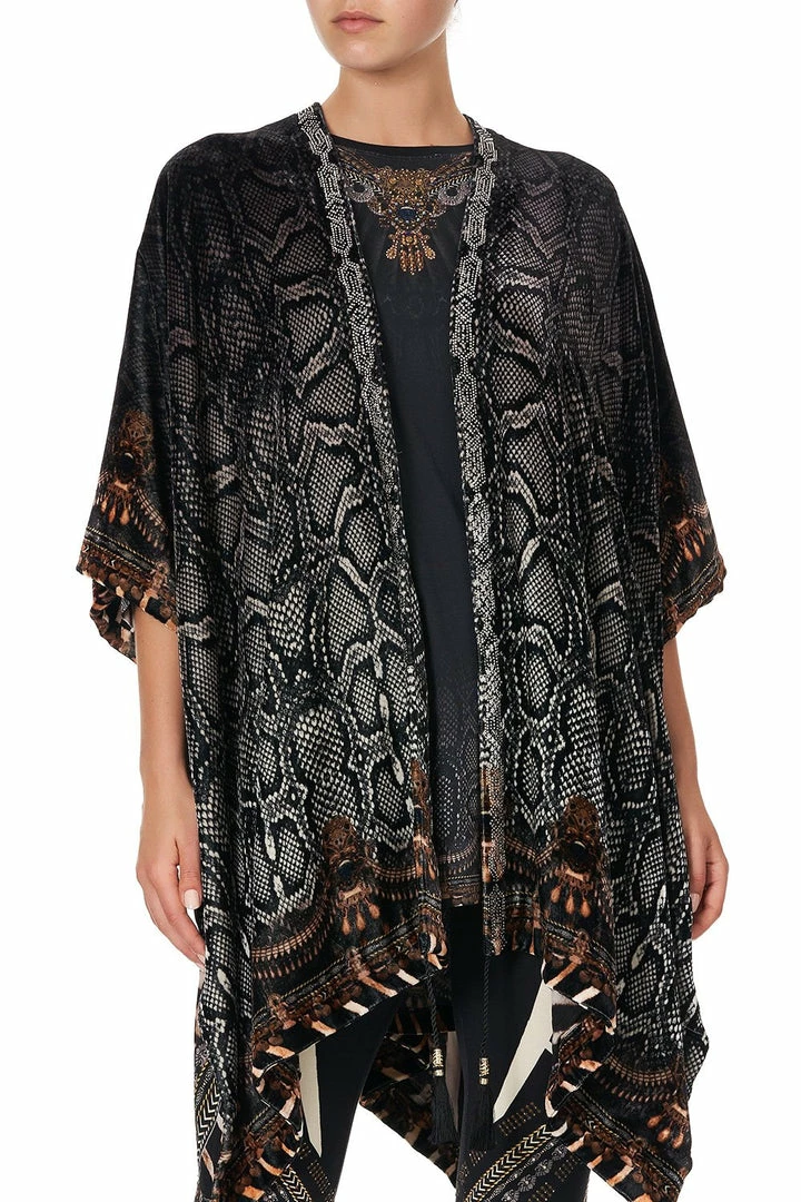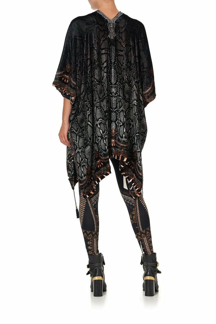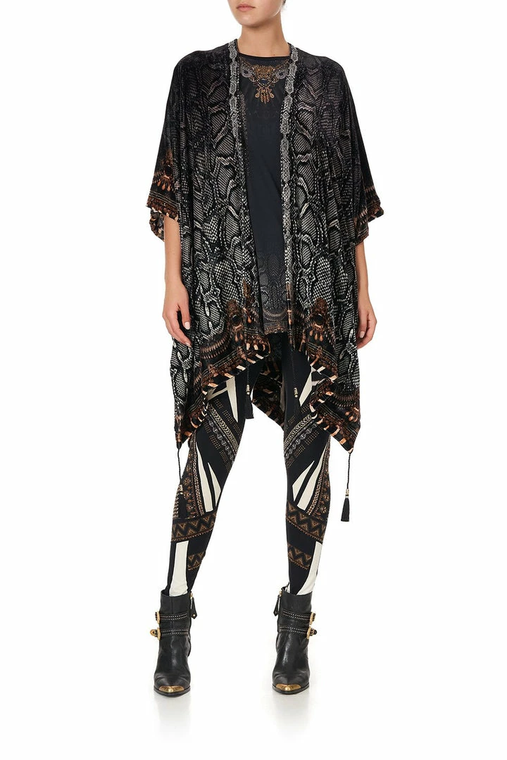 A statement CAMILLA silhouette, the Quechua King Square Draped Layer is immersed in a gradient of grey snakeskin. Inspired by the dawn of time and the wilds that encompassed our earthy plains, soft velvet drapes in a high-low hemline, cropped sleeve length and parts ways into side splits to allow for additional flow. Crystal embellishment defines the neckline while tassel detailing dances off the contrasting hem. Match with the Super Oversized Tee and Leggings.
