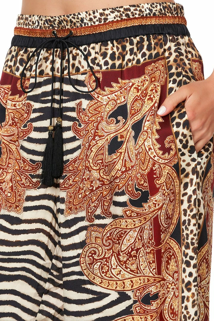 Inspired by the luxurious folk art and striking animal print textiles, the Wild Fire Straight Leg Pant holds rich Russian paisley hues across a bold animal print motif. Crafted in decadent silk, these full length trousers feature inseam pockets, an elasticated waistband with a drawstring. Pair with the Wild Fire Button Down Blouse with Necktie for an elegant evening ensemble.