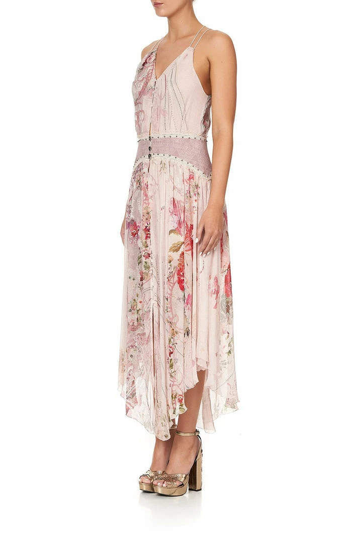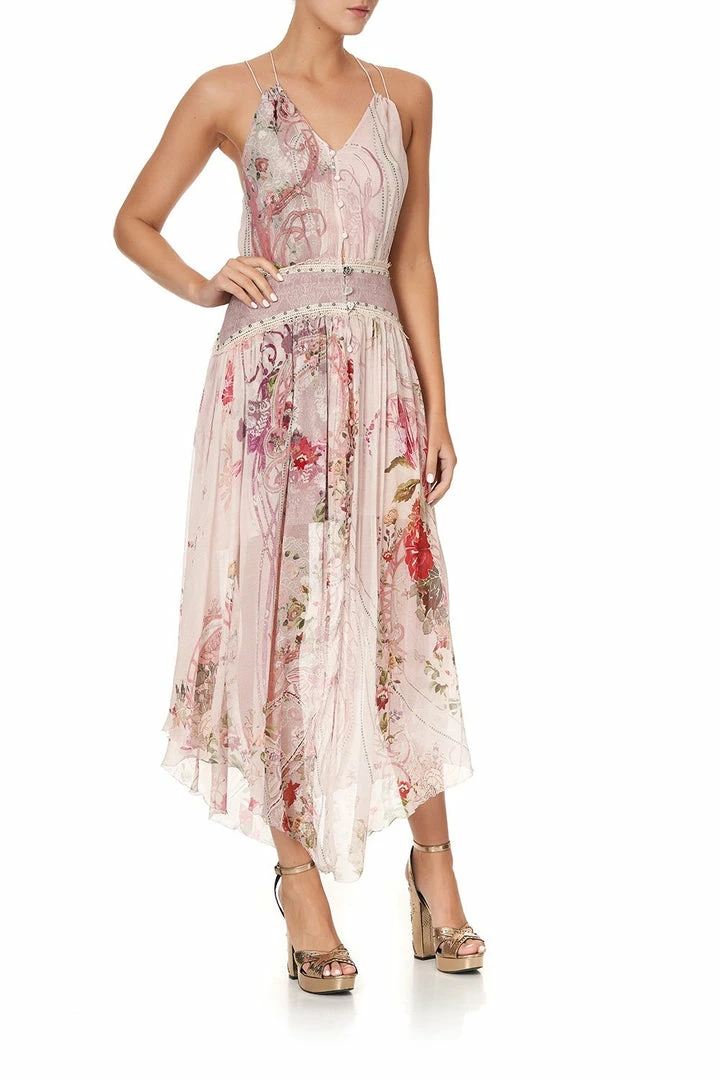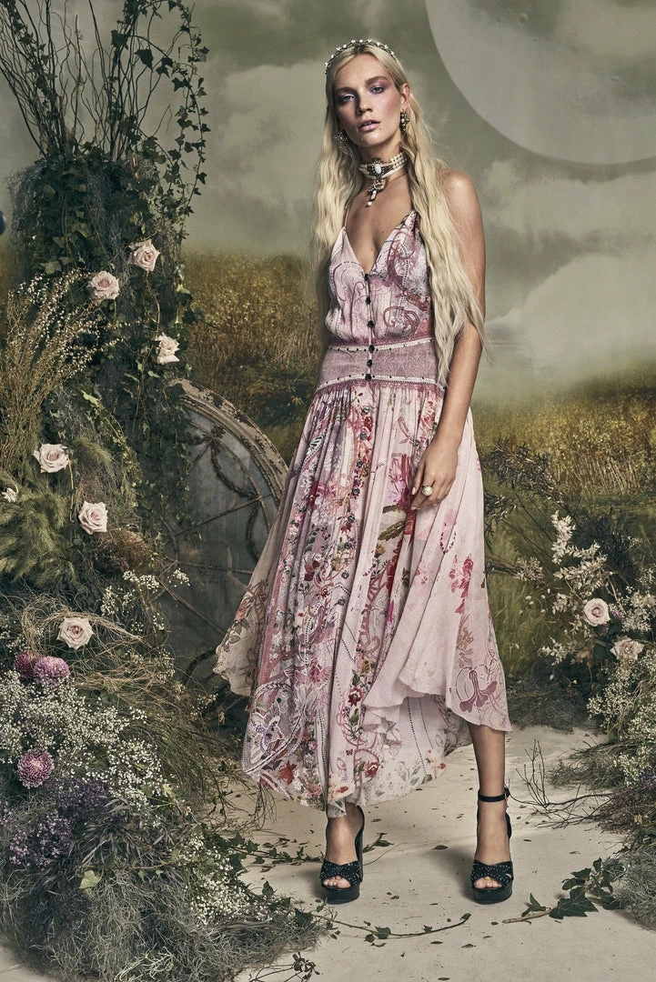 A party statement dress for seasons to come, the Istenanya Strap Dress with Shaped Waistband with Shaped Waistband is every part ethereal. Crafted from a billowing printed silk that explores a hypnotic study of Hungarian fairytales, this statement mid length dress features a boho flared hem and flattering form smoothing shaped yoke, adjustable straps and is finished with hand-applied CAMILLA crystals. Wear this party dress to your next summer event with sky rise heels, or with flats to and all-day dancing festival.