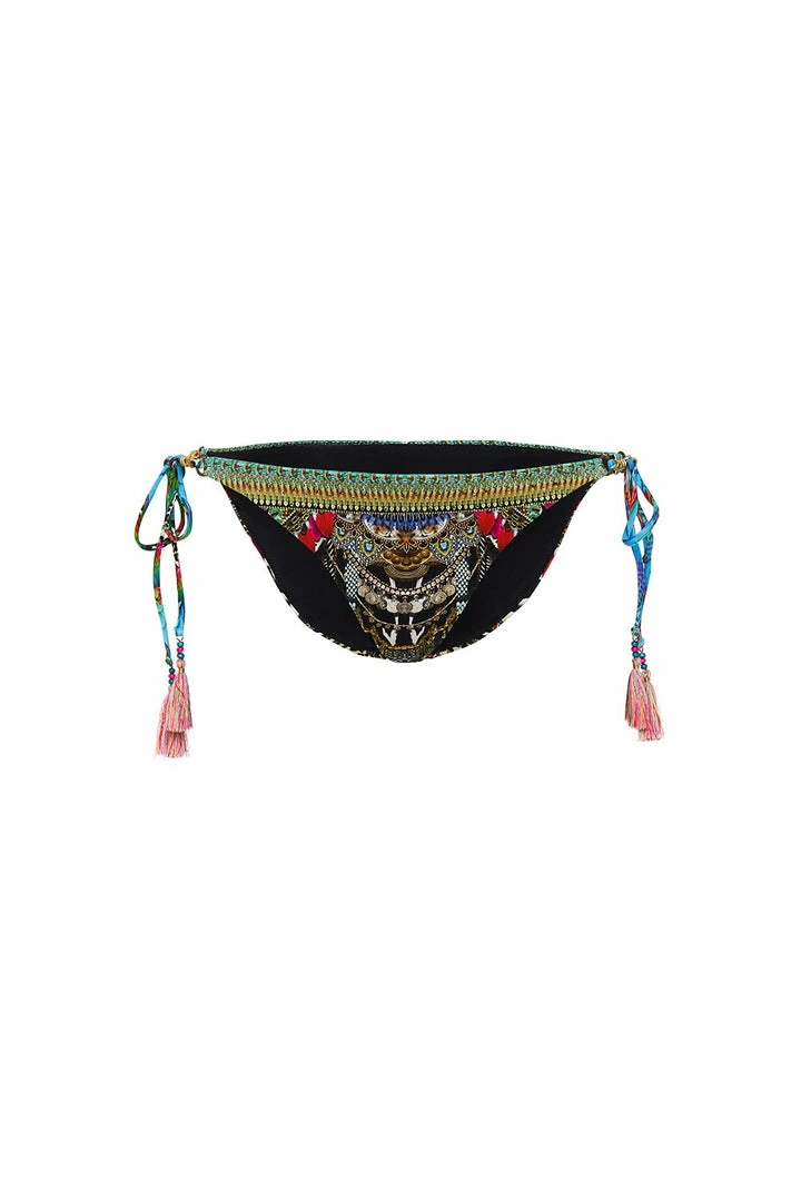 The dawn of time sets the scene with our Guardians of the Sun String Tie Side Pant With Rings. Invite colours to the skin with touches of animal print, teal feather details and ornate metallic chains that swerve throughout. Our sustainable swimwear features side tie fastening, a hipster silhouette, gold hardware details and signature CAMILLA crystal embellishment. Complete the set with the Multi Strap Tri Bra.