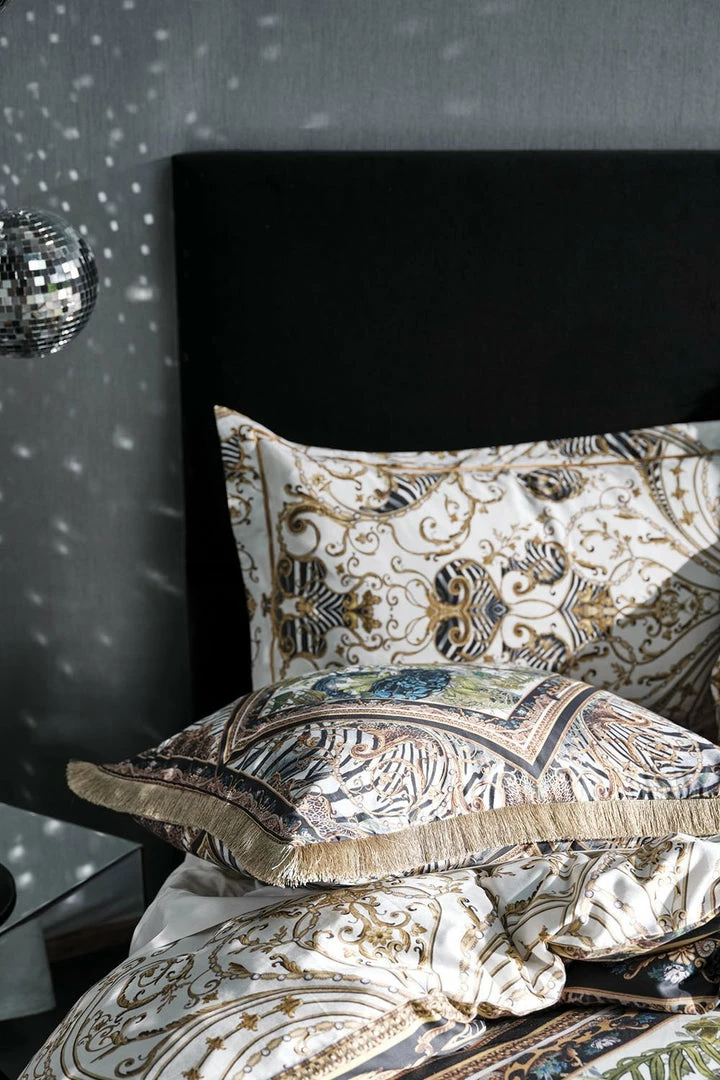 Drawing inspiration from Studio 54, the Night Waiting For Day Super King Bed Quilt Cover Set is a celebration of a Disco Queen’s inner feline. This set is heavenly debauchery set on a print that awakens in hues of gold and zebra. A 500 thread cotton sateen quilt cover boasts a lavish digital print, self-tailored finish and a charming reversible design. Style with the Studio 54 Large Square cushion.