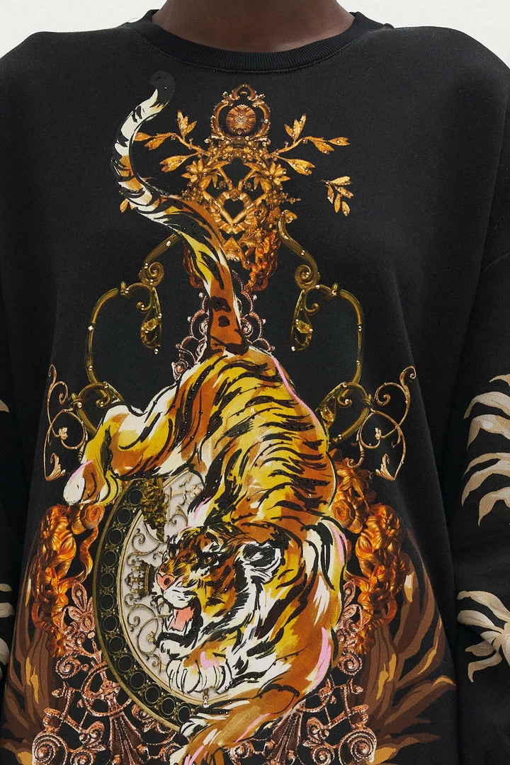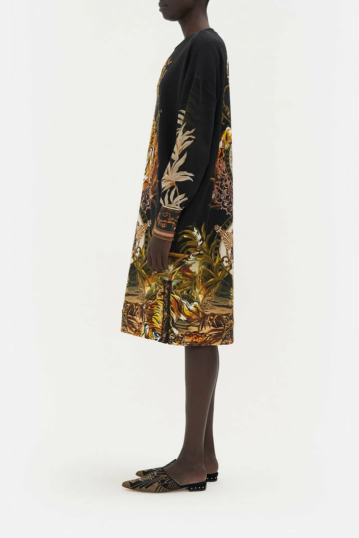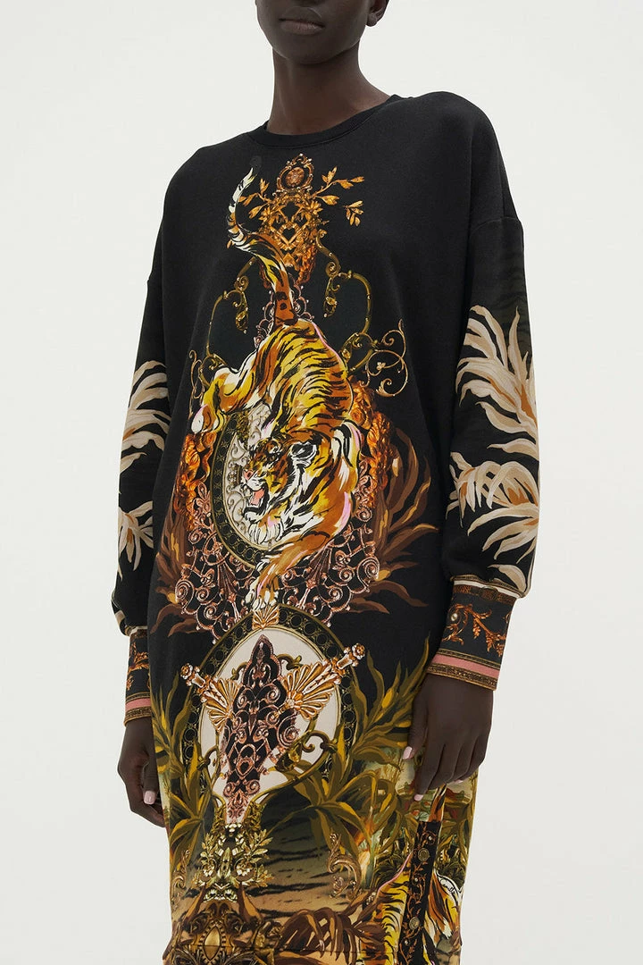 A reimagined take to luxe loungewear, The Queens King Sweatshirt Button Dress explores an intricate mosaic of tigers stalking a sea of midnight, baroque accents and leafy details dipped in utter opulence. Complete with hand-embellished CAMILLA crystals, this cotton sweater dress plays host to a relaxed maxi silhouette, full sleeves that fall into a contrast cuff, a classic rounded neckline and ribbed accents.