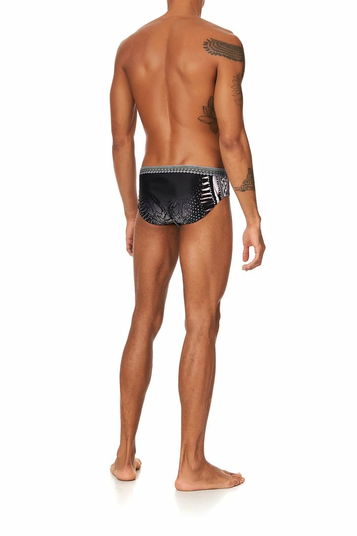 Dip into something cheekier as the sun comes out to play with our Quechua King Swim Brief. Inspired by ancient times and the dawn of the ages, invite shades of midnight and subtle snakeskin to your swimwear as you take on the waves. The silhouette features complete coverage, mid-rise cut, string tapering and mesh lining on the interior. A contrast patterned border wraps its way around the hip to add the final pièce de résistance.