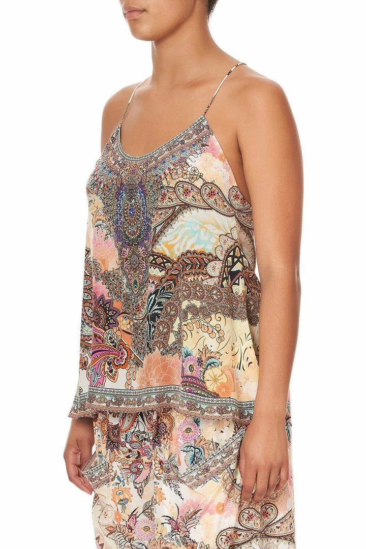 Bring a touch of the swinging sixties to an outfit with the Carnaby Disco T Back Shoestring Top. Covered in pastel paisleys and florals, inspired by London in the sixties, this versatile top can be teamed with jeans by day or with contrasting prints when dressing up. Its flared hem give it a relaxed look while CAMILLA crystals add a touch of disco glamour.