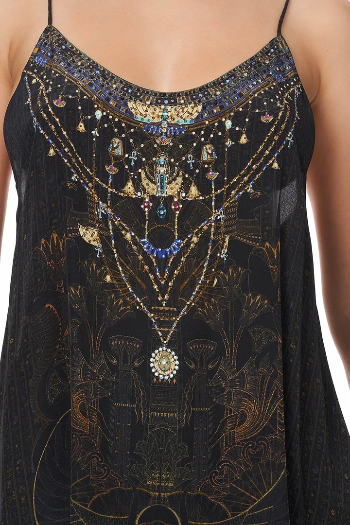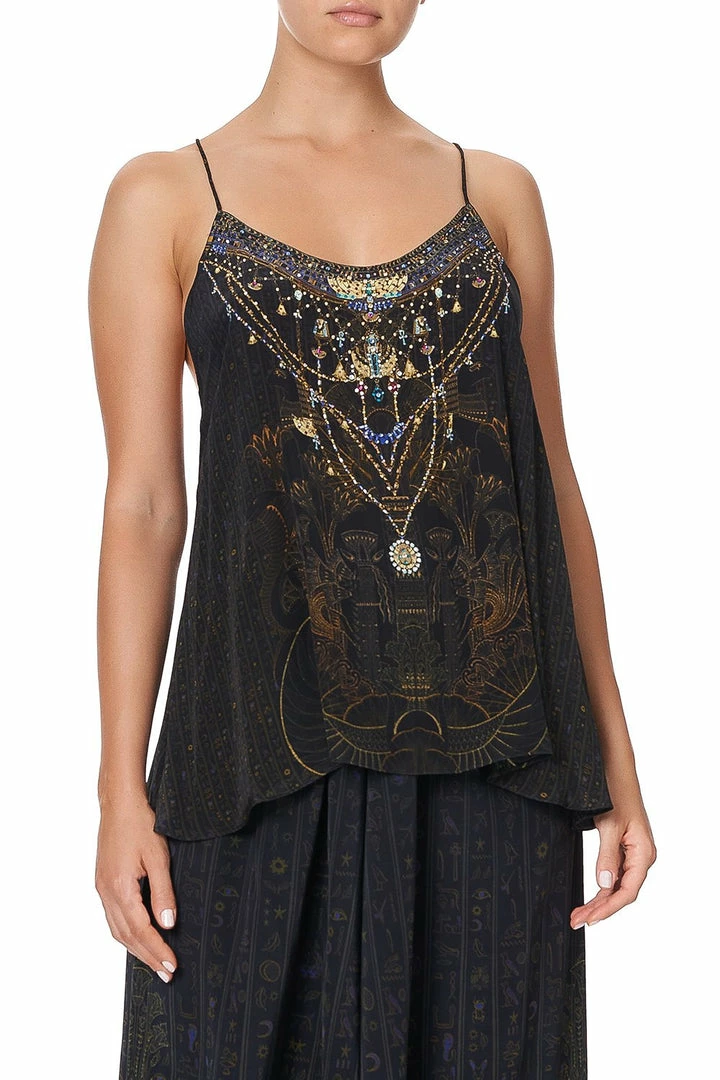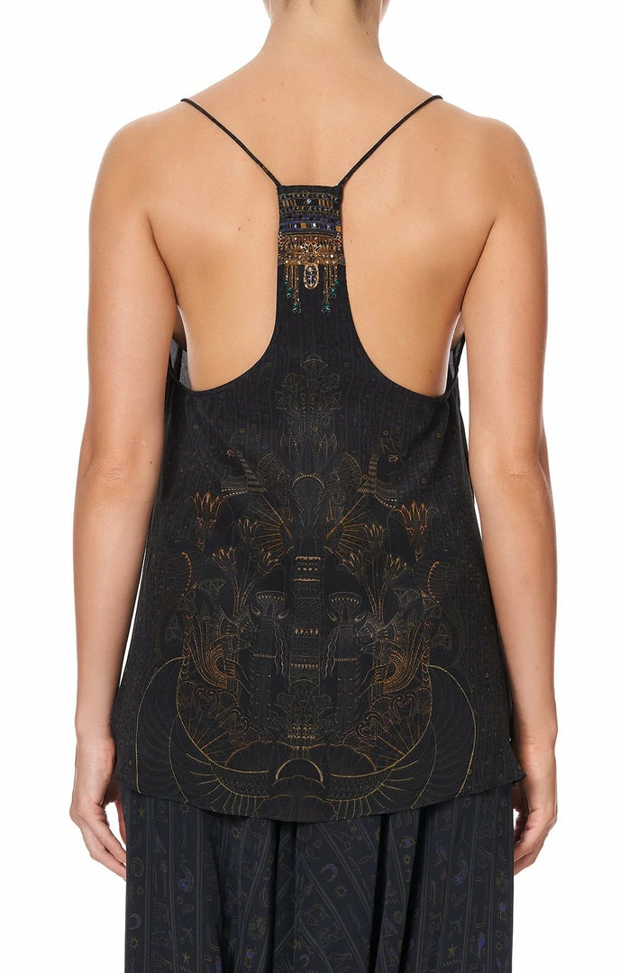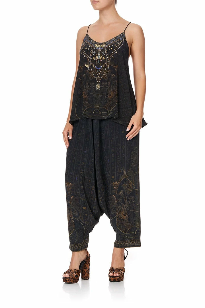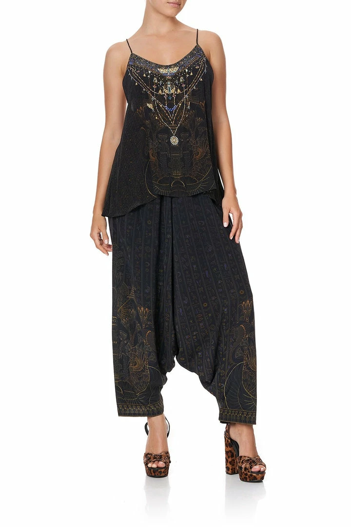 A bold singlet-style top essential to a print lover’s collection, the Cobra King T Back Shoestring Top is opulent with a scene of the unparalleled extravagance of Ancient Egypt. This floaty black-based printed silk top features dainty shoestring straps, round neckline, digitally printed silk, as well as a glittering array of crystals as detail. Pair with matching harem pants for a head-to-toe boho look.