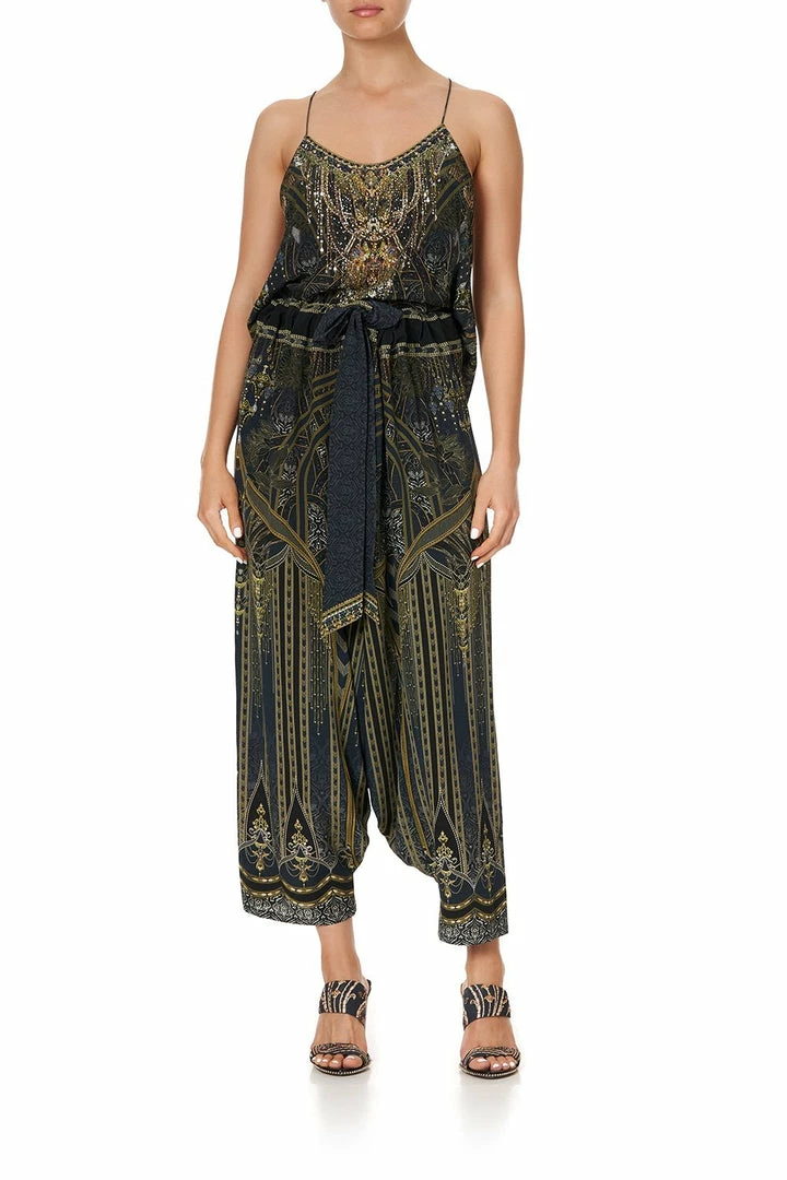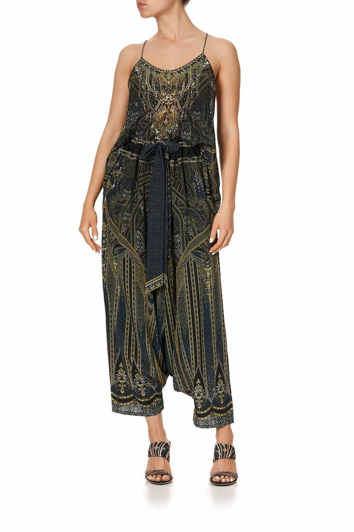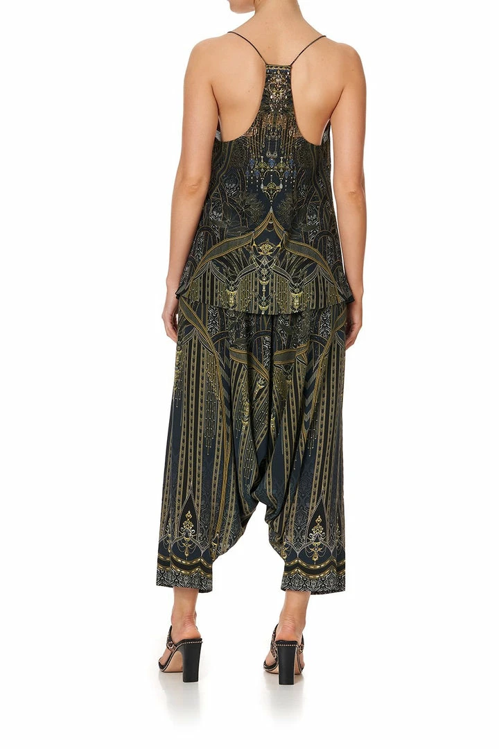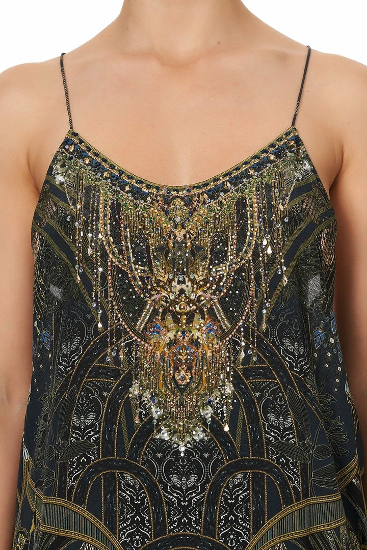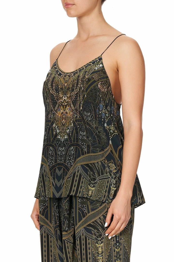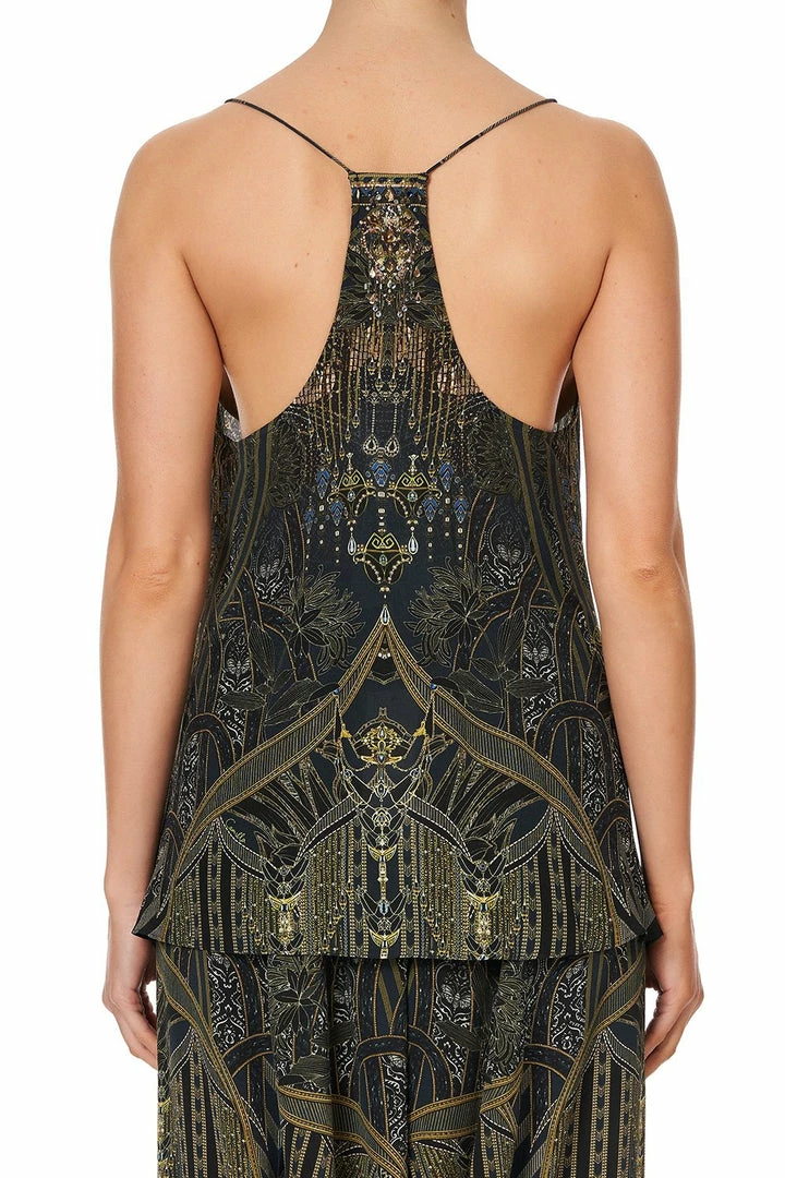 An art deco inspired navy-based print takes centre stage in the Great Scott T Back Shoestring Top. Crafted from signature pure CAMILLA silk, this exquisite piece features gold detailing, a round neckline, shoestring straps, flattering flared hemline and is finished off by hand with CAMILLA crystal embellishments. Pair with the Great Scott Pleated Full Hem Skirt for an effortless summer look.
