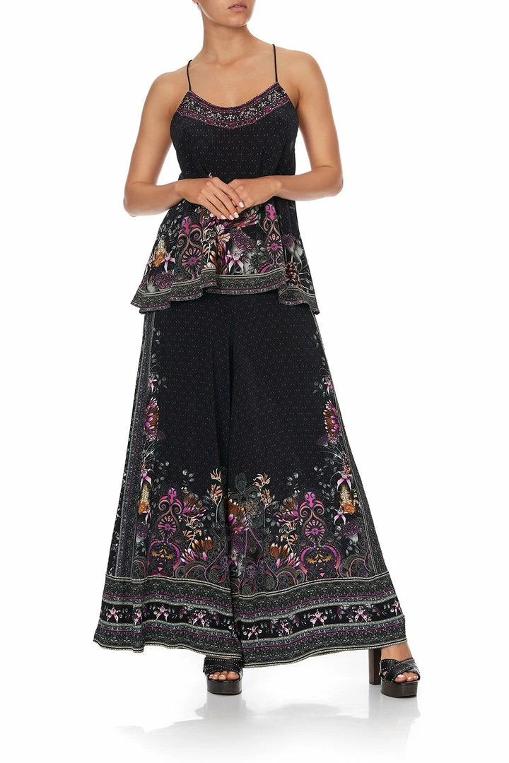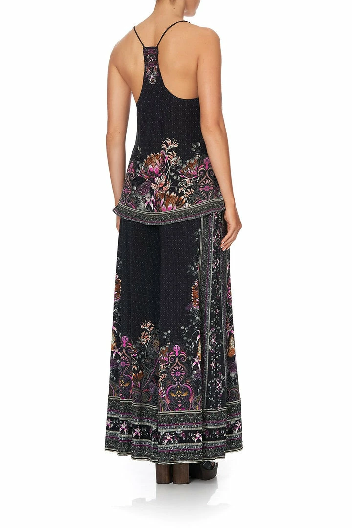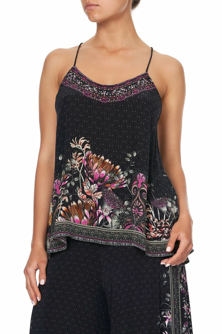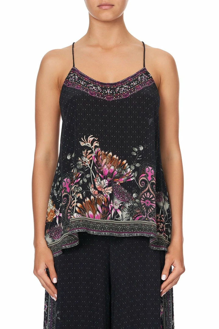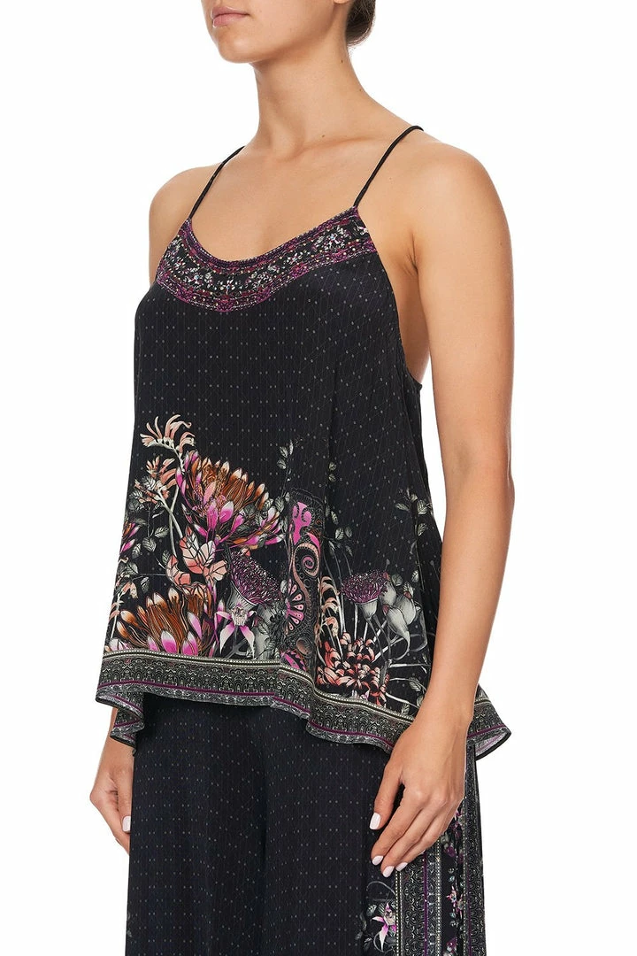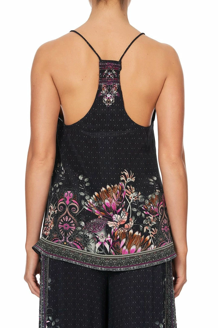 This flowy top has been crafted from lightweight pure printed silk and features flattering contrast shoestring straps, T-Back racer design, as well as a hand-placed crystal embellished chest piece.