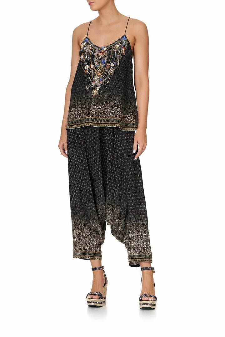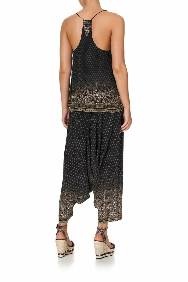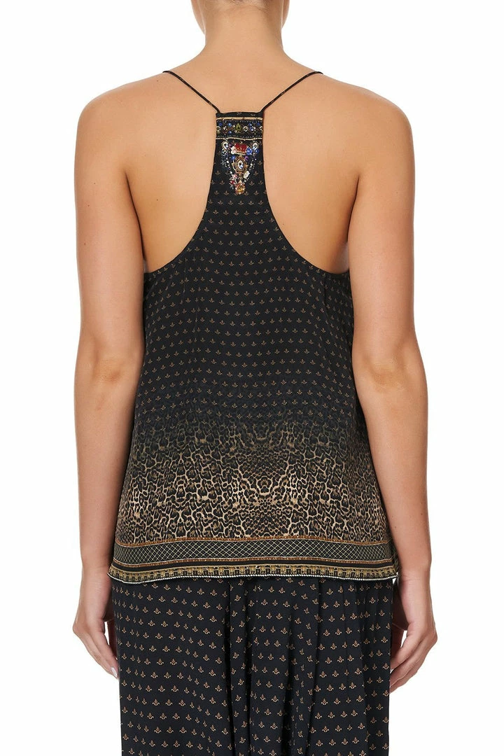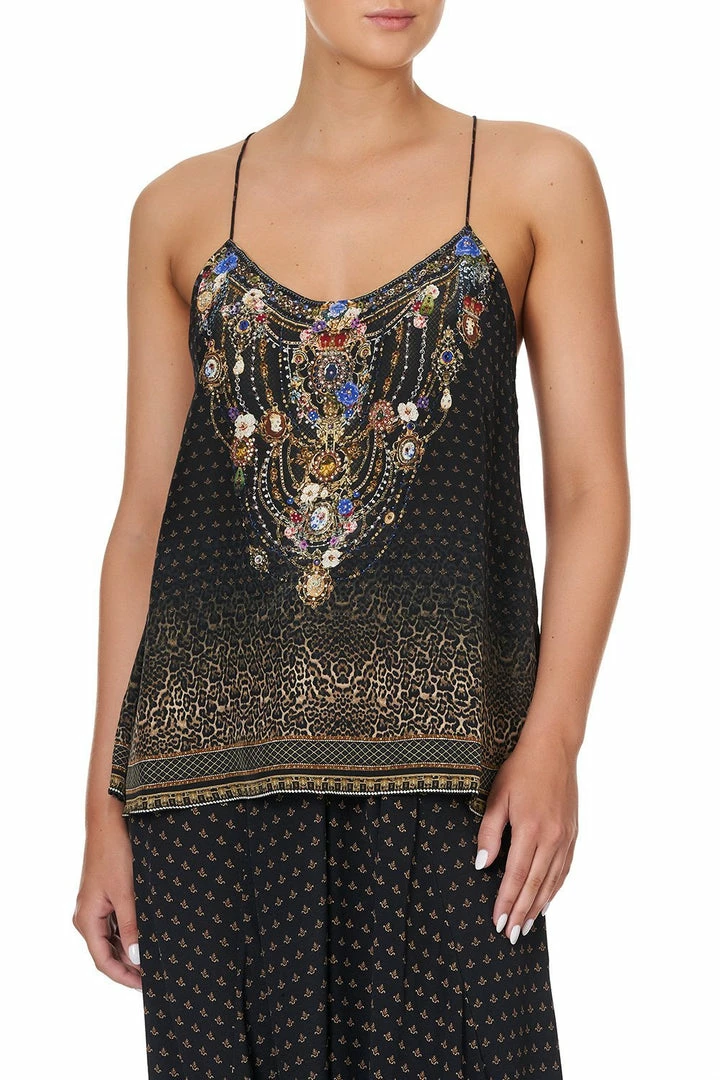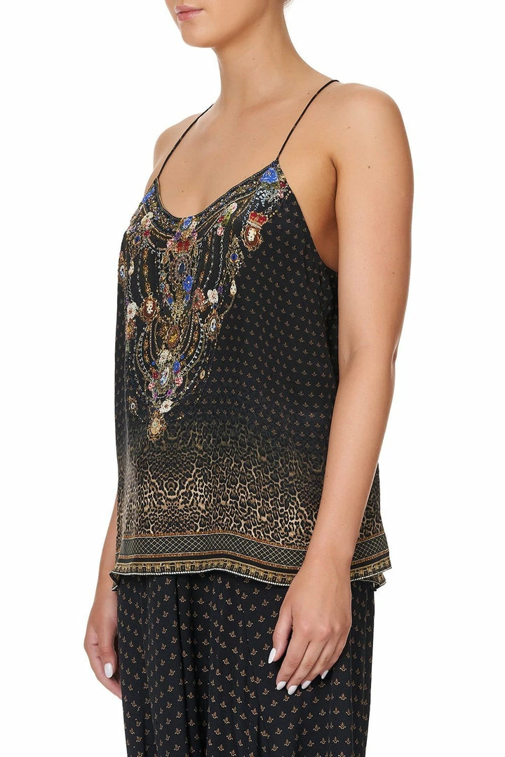 Wild decadence and opulent excess influence the lavish design of the Royal Residence T Back Shoestring Top. Crafted with a round neck, shoestring straps and feminine flared hem, this bold singlet style top features a lavish signature CAMILLA neckline embellished with colourful florals and hand-place crystals. Style with the complementary Palace Playhouse prints for an abundantly luxe look.
