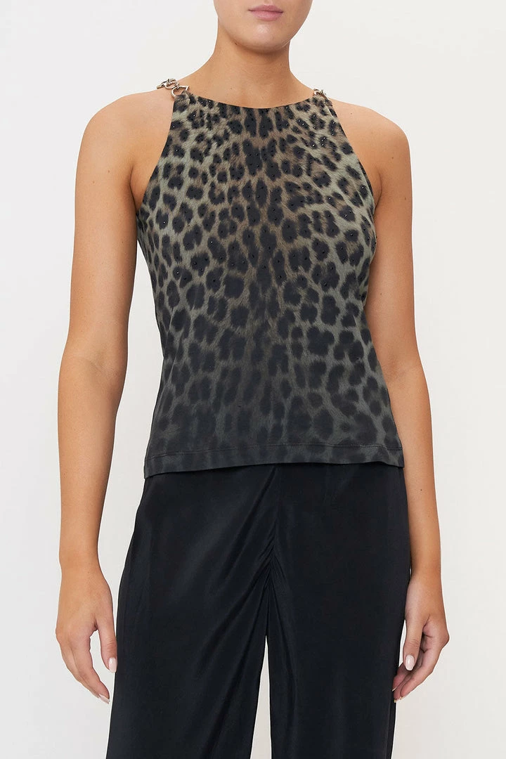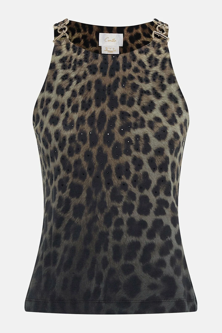 Reimagining the wardrobe essentials with wild majesty, the Order Of Disorder Tank With Hardware captures the gaze with classic leopard print in slated greys as rich gold hardware adorns the neckline. Complete with hand-embellished CAMILLA crystals, this luxury muscle tank features a fitted sleeveless silhouette, a crew neckline and an easy slip-on style.