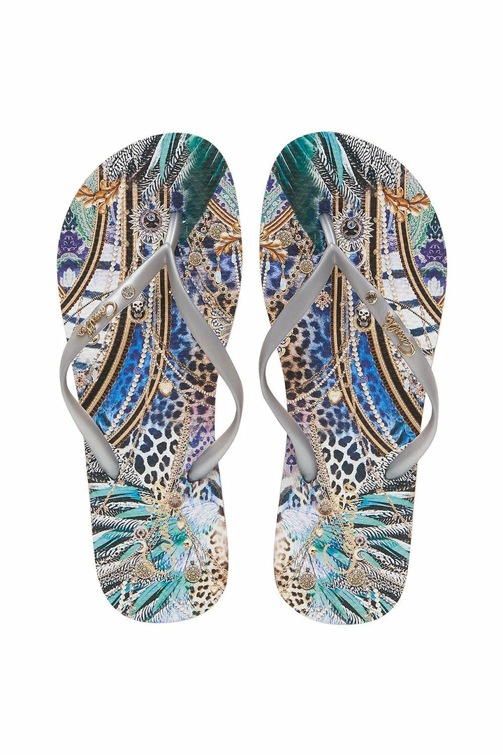 A CAMILLA summer essential reimagined each season, the Animal Army Thong is inspired by the anthem of a rock and roll revolution. Electric shades of blue and green dance with pops of animal print on the printed rubber canvas. The easy slide on fit makes this statement flip flop the ideal footwear choice for sunny days by the pool whilst CAMILLA logo and crystal embellishment along the strap add a touch of elevate luxe. Style back with matching resort pieces from the Animal Army collection for a casual look with a rock and roll edge.