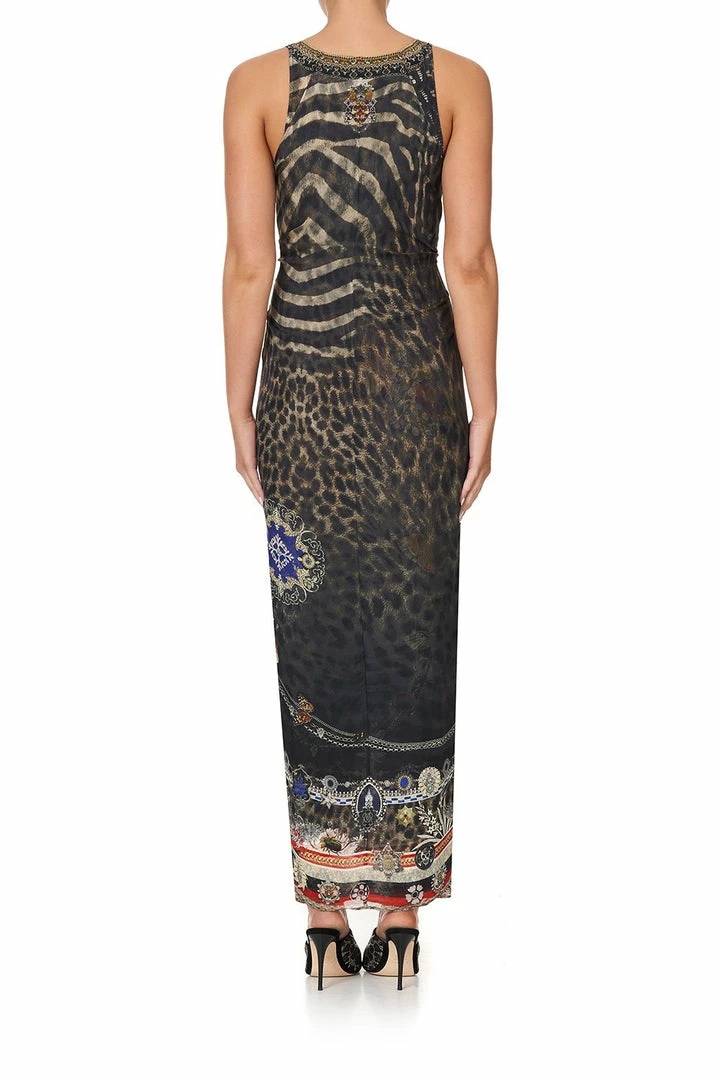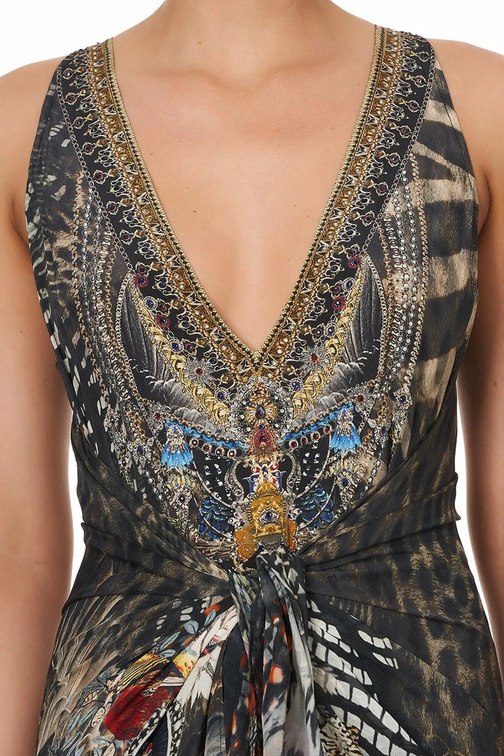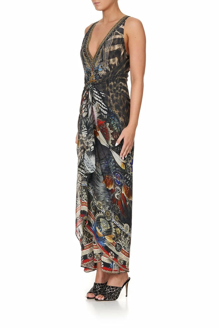 Radiating an unbridled sense of wild freedom, the Treasure Chaser Tie Front Multiwear Dress is a bohemian style inspired by a rock-and-roll starlet free of inhibitions. A harmony of animal prints acts as a rich canvas for the colourful symbols of freedom, personified by decorative butterflies fluttering alongside vibrant plumage. Crafted from pure CAMILLA silk, this floor length style is cut with a seductive crystal embellished low V-neck and features a sheer overlay that offer multiple styling options. Styled loose at the sides, the silk overlay creates a billowing boho look, perfect for beach bar relaxing. Tied in a knot at the front this versatile floor length dress takes on a more seductive silhouette. Pair with bright heels and statement earrings then hit the dance floor.