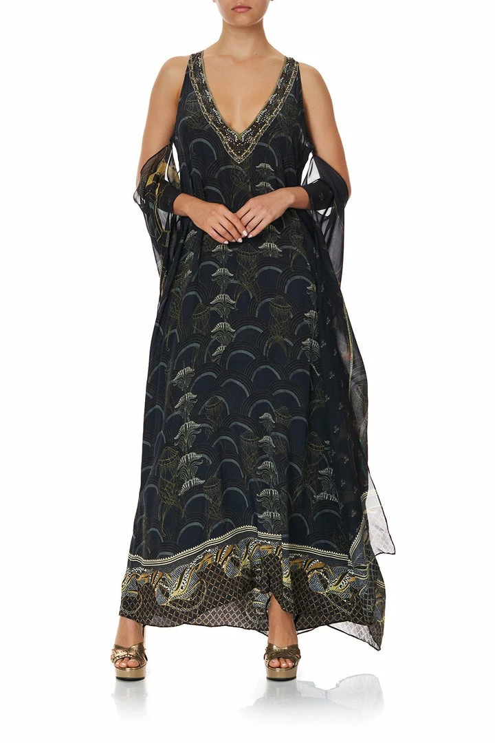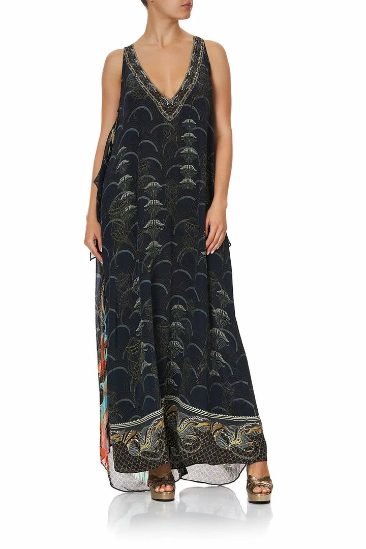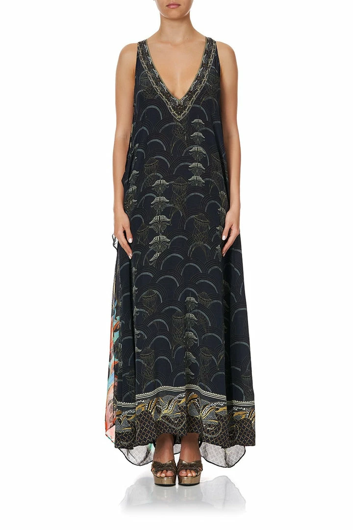 A boho chic maxi dress with sights set for the summer ahead, the Wise Wings Tie Front Multiwear Dress is luminous with midnight musings of Persian folklore creatures. This sleeveless floor length printed silk dress is designed with an alluring low v-neck, a wide sash panel that can be worn draped at the back or tied to the front to accentuate form and is finished hand placed CAMILLA crystal embellishments that adds a layer of radiant luxe. A versatile piece that can be worn from beach to bar.