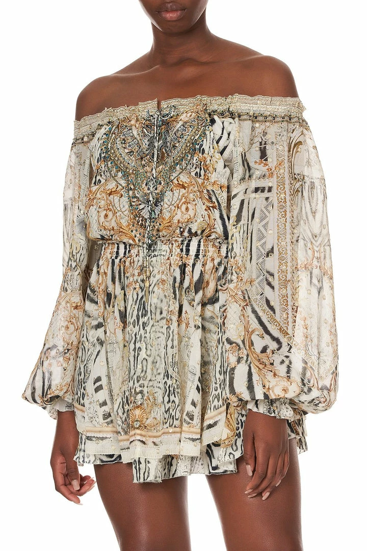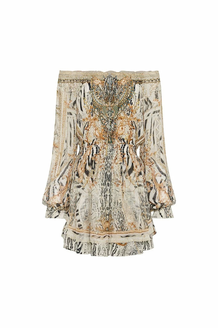 With London’s fashion aristocracy of the swinging sixties as your muse, give in to the escapism captured in the Gates of Glory Tiered Mini Dress, inspired by the Biba Boutique’s vibrant interiors. Brewed in sumptuous silk in pronunciations of white tiger and opulent golds and infused with CAMILLA crystals, this playful summer dress features flouncing blouson sleeves, worn off the shoulder to add romance. A tiered hem and shirred waistband and cuffs add structure for an effortlessly breezy look. A perfect dress to wear as a wedding guests or for relaxed garden parties.