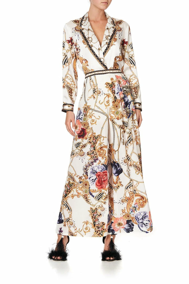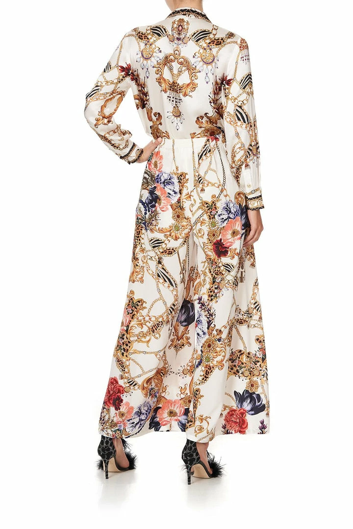 Elevate the wardrobe essentials with the Reign Supreme Tuck Front Pant. Crafted for the party season and beyond, inspiration called from the tantalising nineties. Sporting a soft ivory hue, ornate golden accents dance amidst splashes of florals and leopard print. This statement pant plays host to an elasticated waist to add cinch and shape, an ankle-grazing wide leg and patch pockets. Style with the Raglan Sleeve Button Up Top.