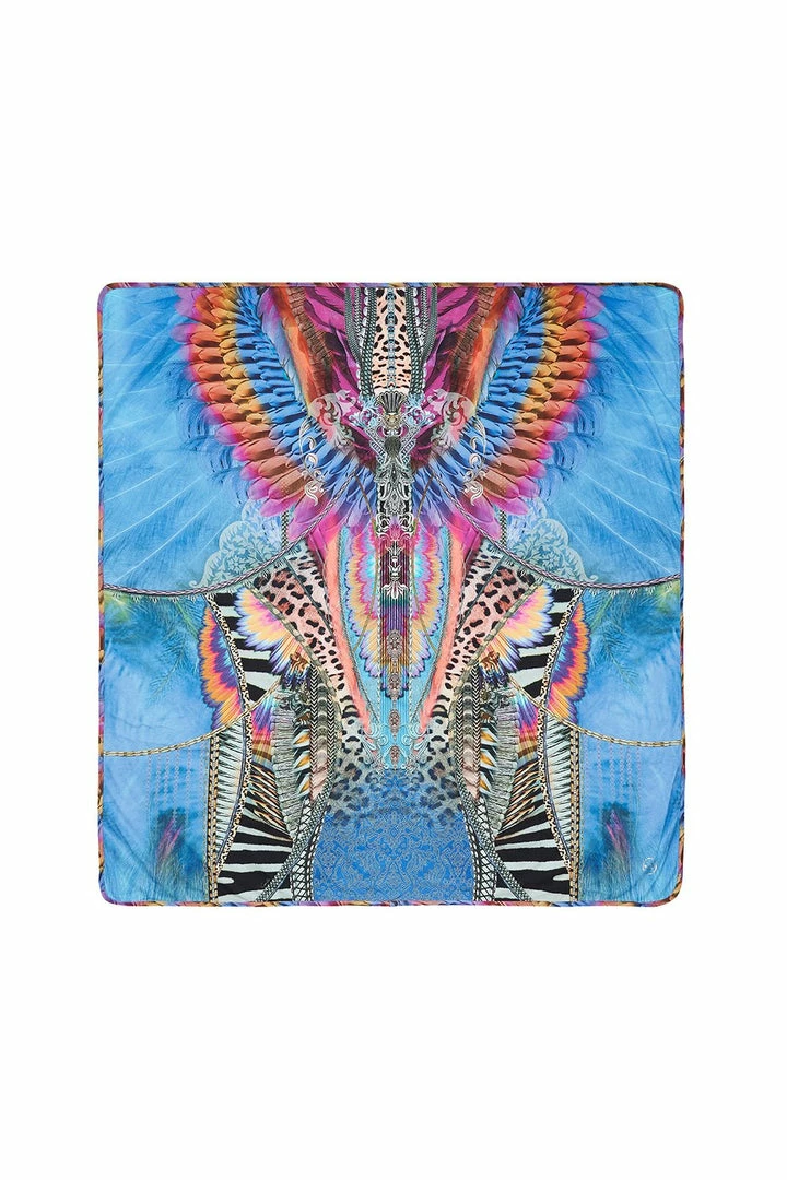 Crafted from the softest pure cotton, the Love On The Wing Babies Blanket is a colourful ode to nature. A sea of blue is decorated with bright leopard and zebra prints and crowned with a majestic feather motif. This square cotton baby wrap has a self-bind edge and its soft-touch fabric is the perfect textile to invoke a peaceful slumber.
