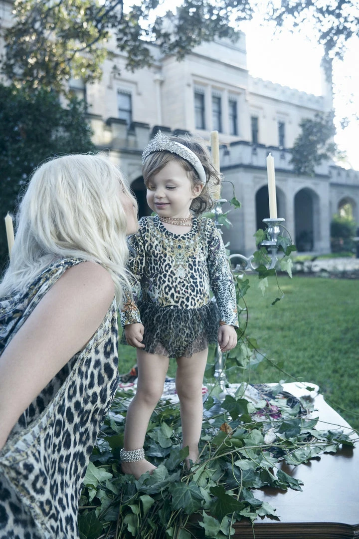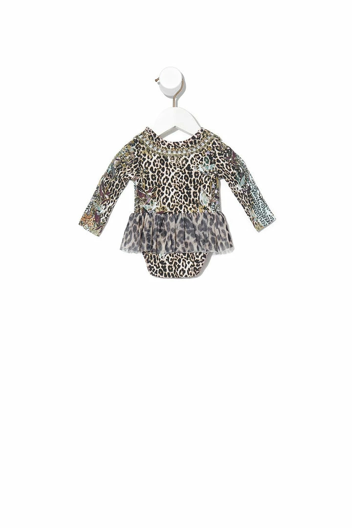 For tiny little twirls in the sweetest ensemble, the Nomadic Nymph Baby Tutu Romper is crafted in a dreamy fairytale print that glimmers across a bold leopard print backdrop. It features a round neckline, press stud openings, long sleeves and a full gathered tutu skirt. A wardrobe essential for your tiny dancer.