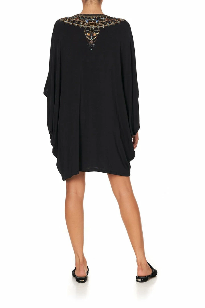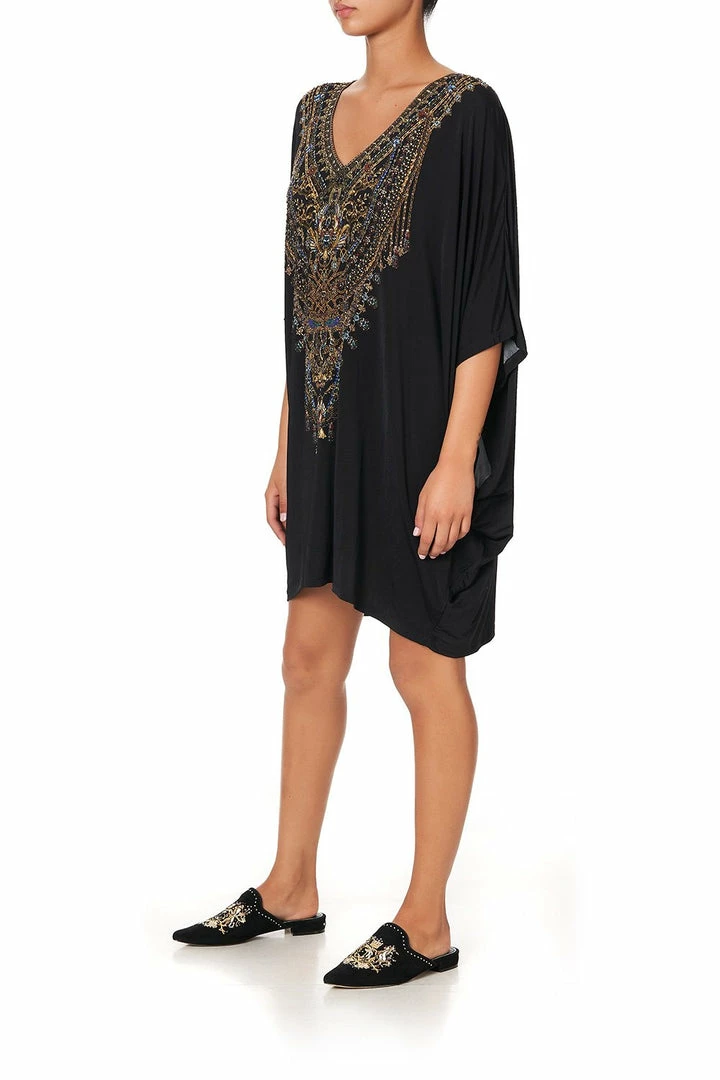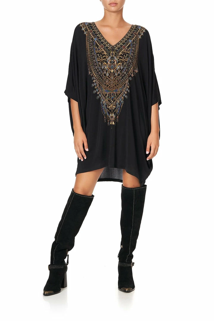 Channelling the bygone wonder of the swinging sixties, the Abingdon Palace Bat Sleeve Dress radiates the glorious eccentricity of London’s first destination boutique. Tailored with a relaxed silhouette in a print of gilt decals with leopard print accents, decorated with a flourish of hand placed crystals. This jersey kaftan makes for versatile resort wear, style with the addition of CAMILLA accessories to elevate this stunning bat sleeve dress into a breezy evening ensemble.
