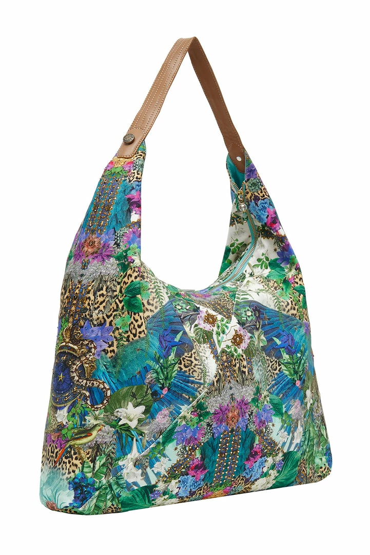 A luscious boho bag for the wandering gypsy, the Moon Garden Beach Hobo radiates a lush portal into the mystical world and beyond. Crafted with soft 100% cotton, this slouchy hippy bag features beaded tassel, soft leather strap, internal zip pocket and is finished with hand applied CAMILLA crystals. Perfect for beach trips or for an effortless every day piece.