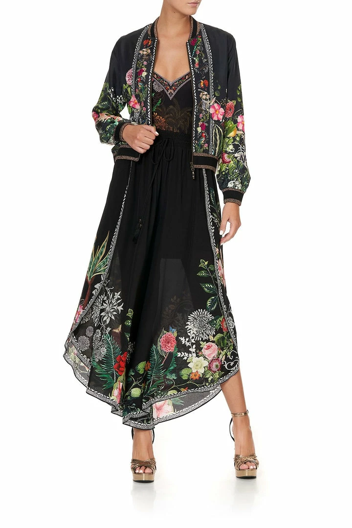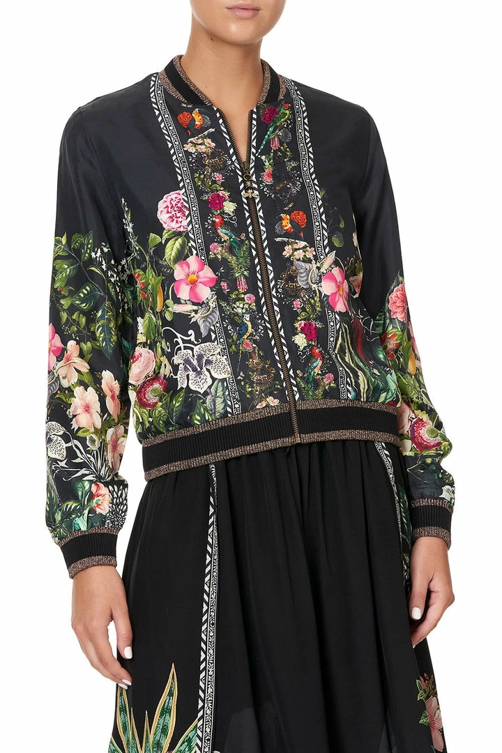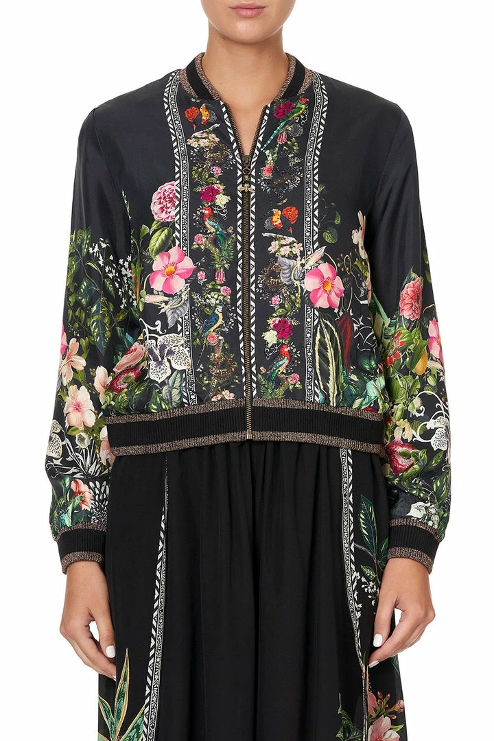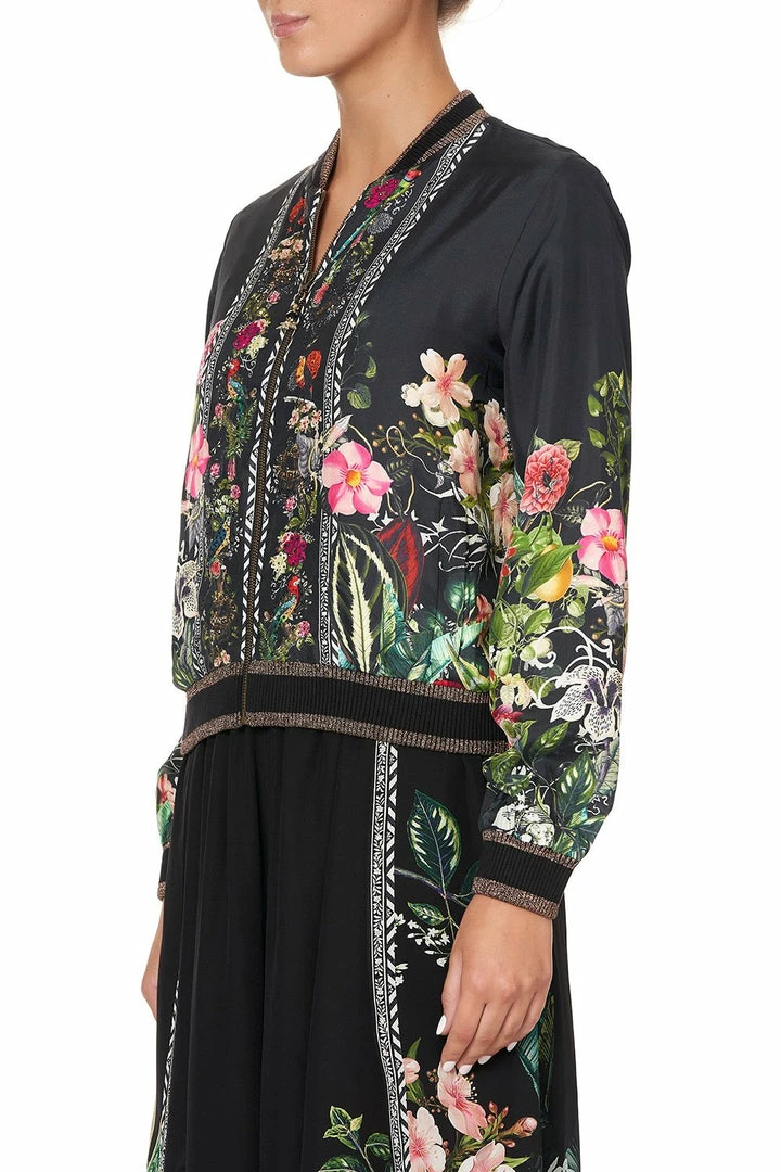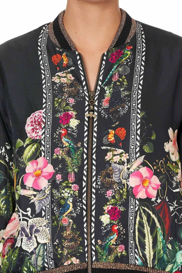 A street style classic jacket enchanted with readings of fairytales, the Raised With Wolves Bomber Jacket is sportswear luxe. Crafted in a buttery soft yet structured printed silk that honours a the childhood of a boy raised in the jungle, this black and rose printed jacket is fully lined and features ribbed cuffs, hand embroidery on the back, collar and hem, as well as front pockets and hand-applied crystal embellishments. A masterpiece of effortless cool, wear over matching Raised With Wolves Curved Hem Pant.