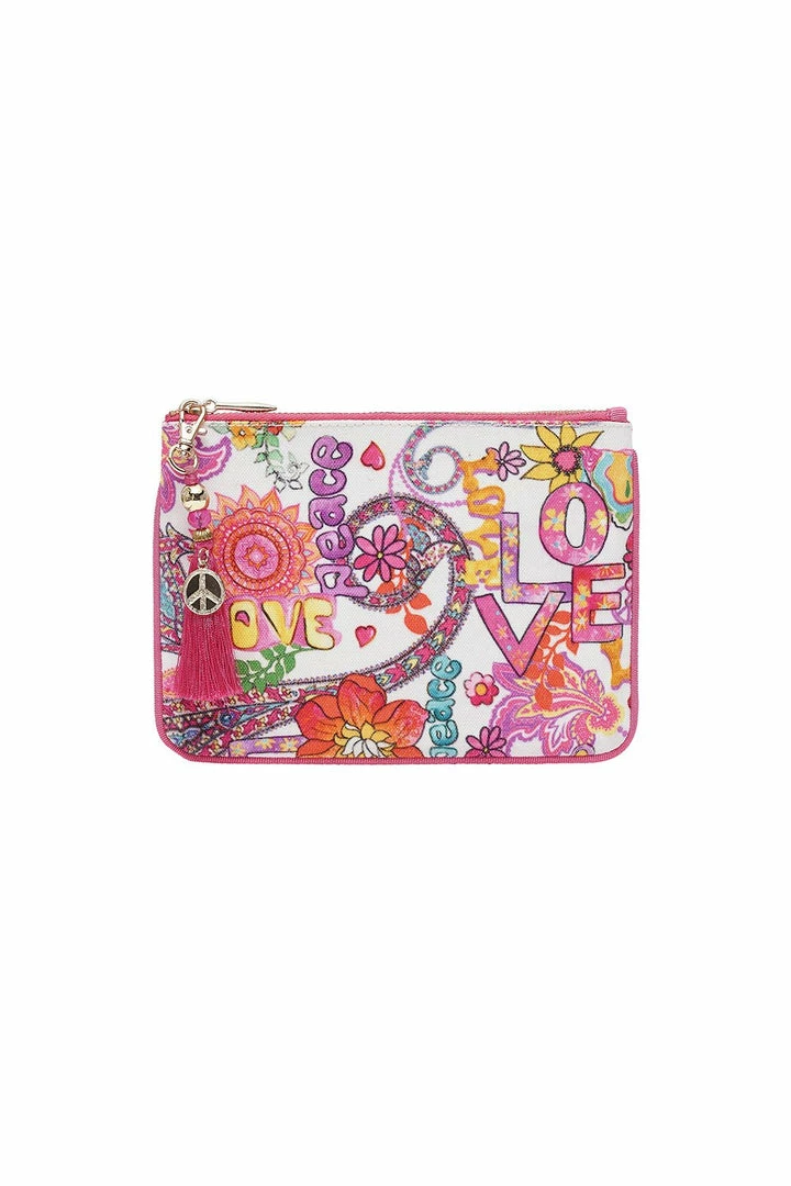 An enchanting purse for flower children, the Let The Sun Shine Coin And Phone Purse is a mystic crystal revelation promoting peace, love and happiness. Decorated with neon hippie philosophies, this canvas wallet is the perfect accessory to store your treasures. Finished with piped edge and groovy tassel, add to your boho look to spread harmony and understanding or gift a peace-loving friend.