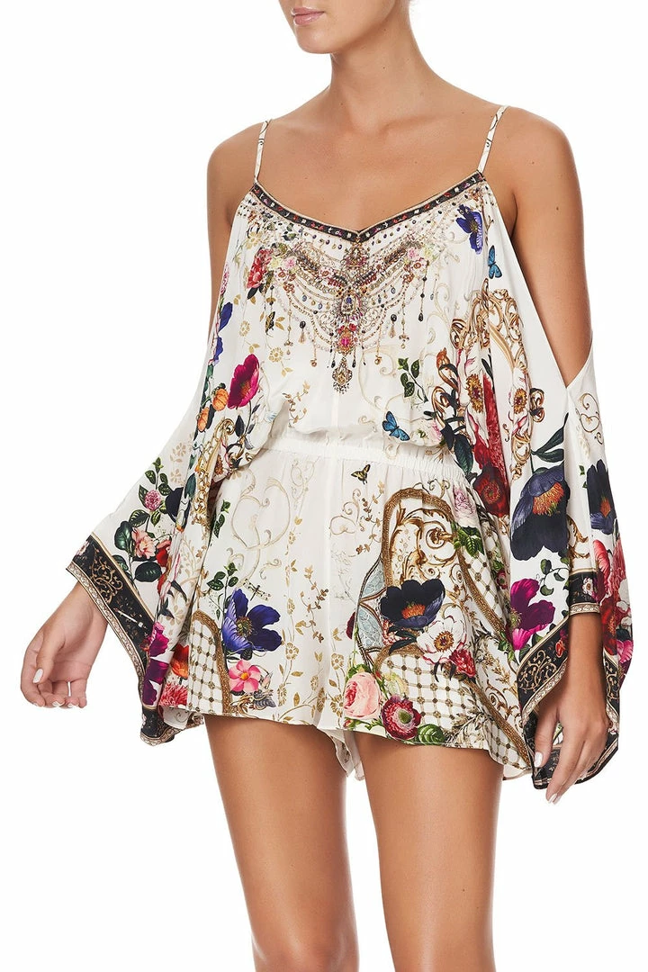 A playsuit designed for lovers of happily ever afters, the Fairy Godmother Drop Shoulder Playsuit is a classic CAMILLA piece, enchanted with accents of fairytale magic. Crafted with a bespoke CAMILLA print inspired by a bouquet of hand-painted florals blooming against a fanciful cream back drop, this playful piece features billowing sleeves, adjustable shoestring straps to lengthen for the perfect fit and is finished with hand-applied CAMILLA crystals. Shine bright at a festival or slip into for a summer soiree.