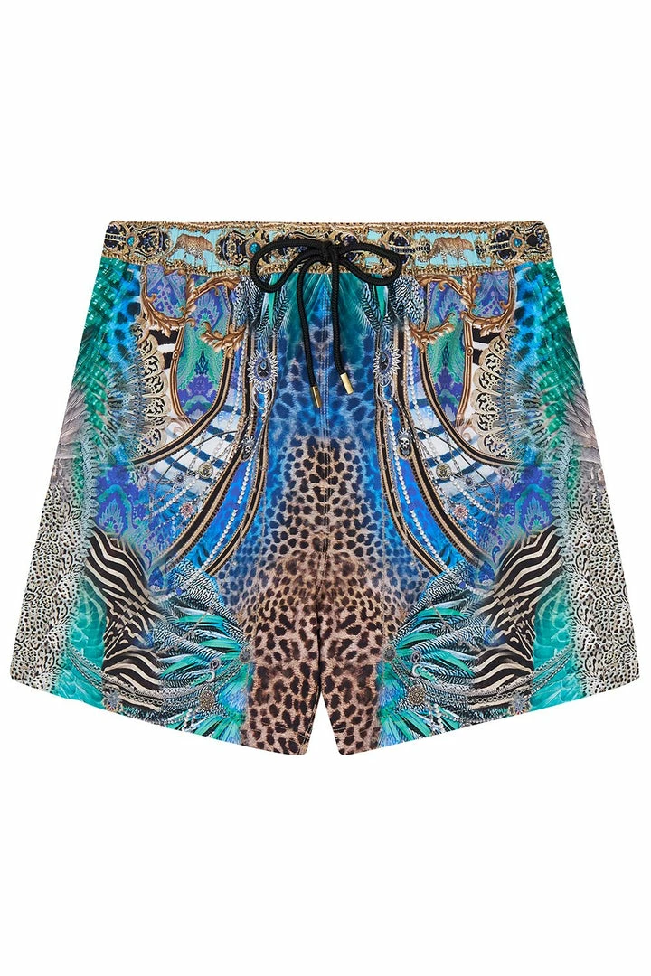A musical medley of print and colour, the Animal Army Elastic Waist Boardshort is inspired by the anthem of a rock and roll revolution. Expertly crafted from a sun safe fabric these printed mens swim shorts are styled with side pockets, Velcro back pocket and contrast black drawstring waist tie. The striking print blends green and blue tones with animal accents and swirling gold highlights whilst skull motifs and whimsical animals add a touch of CAMILLA rock magic to the look. Pair back with the matching Animal Army Short Sleeve Camp Collared Shirt for head-to-toe vibrancy worthy of the spotlight.