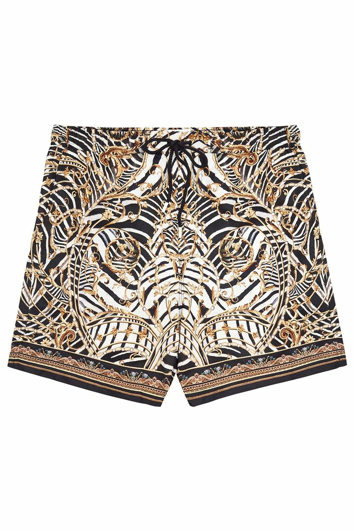 An opulent swim short for the print-loving gentleman, the Night Waiting For Day Elastic Waist Boardshort embodies a scene of Studio 54 fun. Crafted in a hypnotic black-based print enriched with hand painted florals, these relaxed fit swim shorts feature a comfortable elastic waist with drawstring and toggle ends, front pockets with mesh lining, a back pocket with Velcro closure and an external eyelet for drainage. Pair back with matching Round Neck T Shirt.