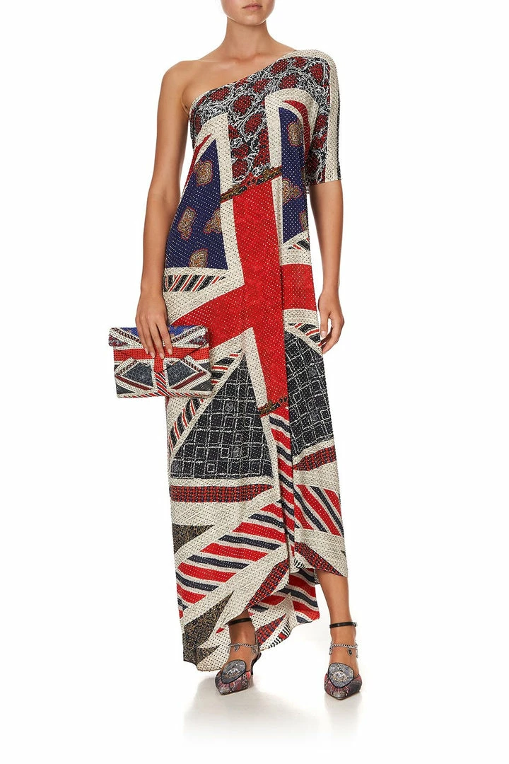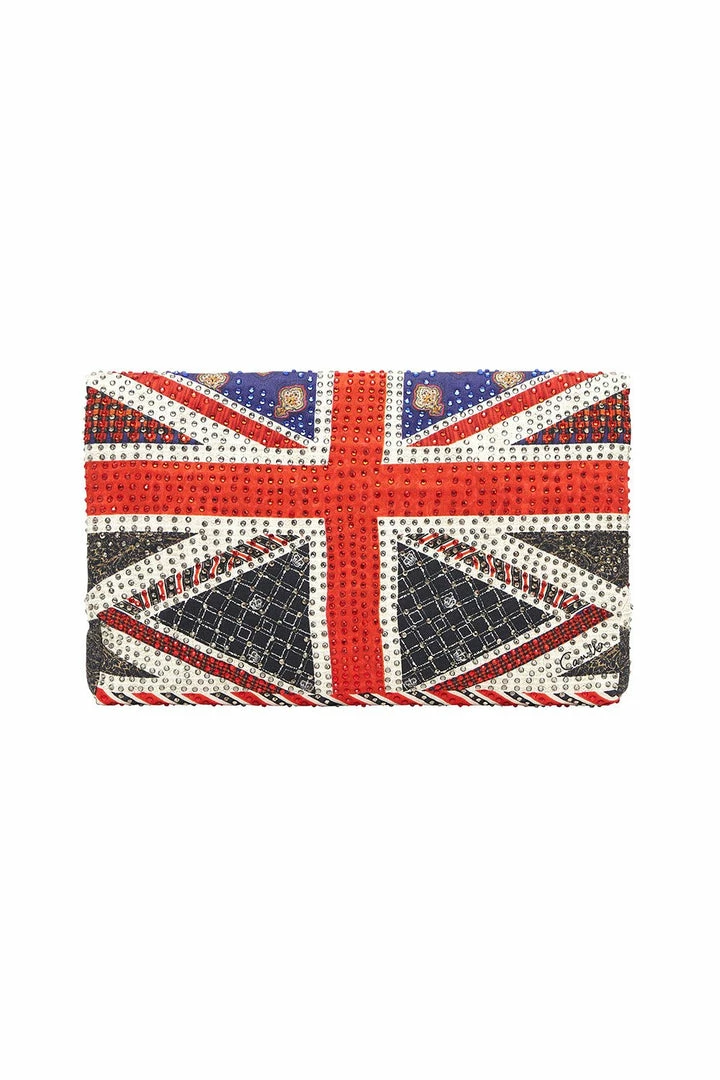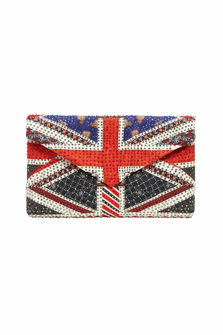 Flying the flag for artisanal anarchy, the Jack Be Nimble Embellished Envelope Clutch pays homage to the pioneers of British punk. A piece of true craftsmanship, this envelope purse is hand embroidered with CAMILLA crystals in a show stopping red, white and blue luxe patchwork design. A true conversation starter, this colourful clutch is finished with a quilted lining, internal zip pocket and magnetic snap fastening.
