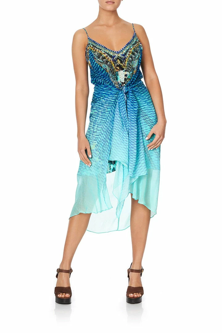 Romantic mini dress, the Marine Queen Flared Mini With Sheer Overlay draws inspiration from sparkling sunlit waters revealing underwater marvels of ombré turquoise hues. This ethereal draped overlay dress features a flattering v-neckline, mini underlay, long sheer contrast overlay creating a charming high low hem, deep v-back with CAMILLA beaded ties and hand placed crystal embellishments on delicate pure printed silk.