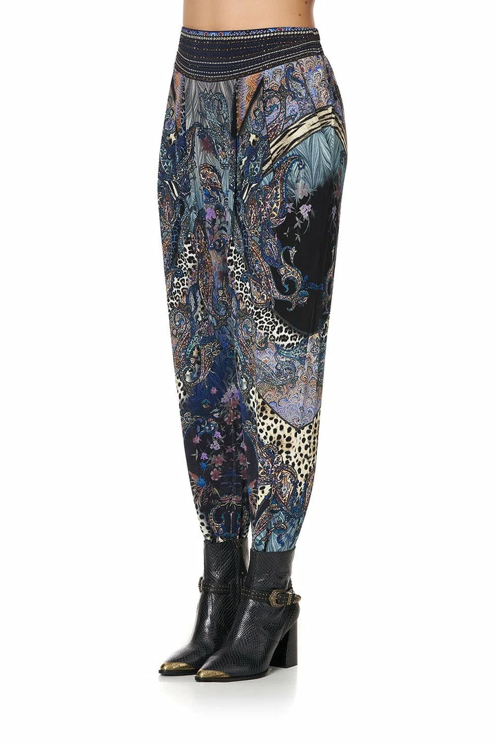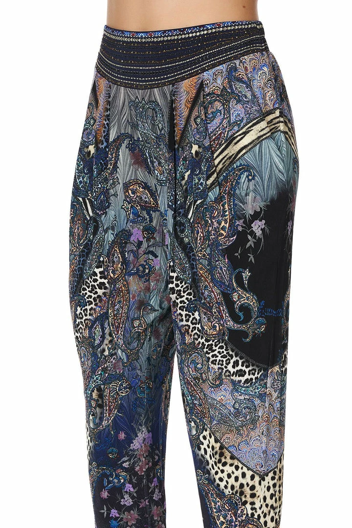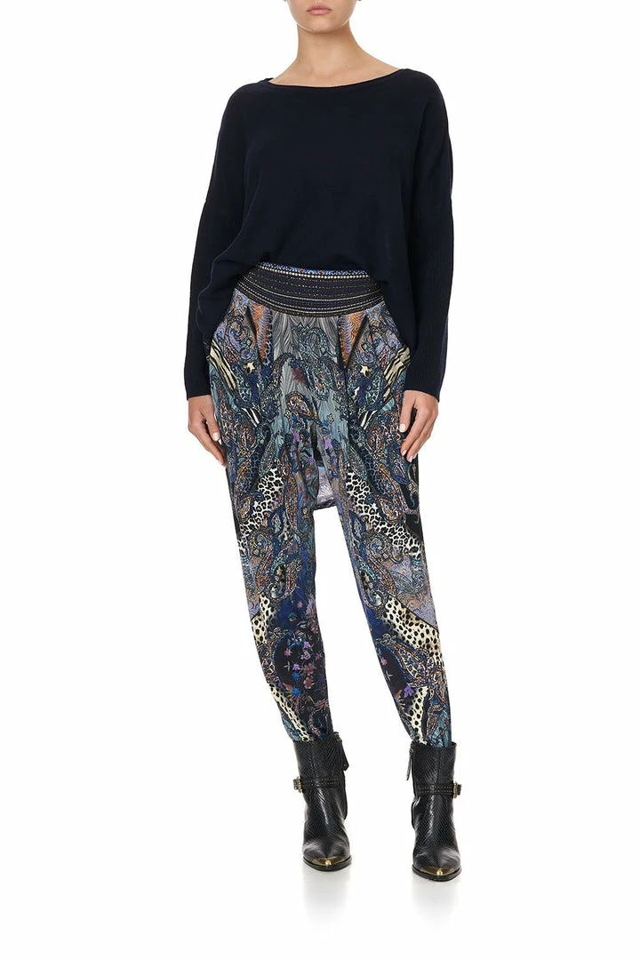Opulent navy blue hues contrasting with fierce animal textiles, the Festival Express Harem Pants With Front Pleats are enchanted by a print reminiscent of Janis Joplin and her electrifying music making her body completely and utterly unbound. Crafted in a soft viscose jersey, these harem pants feature a relaxed fit, a wide waistband, front pockets, pleating at the front and hand placed CAMILLA crystal embellishments. Pair with the Festival Express Long Sleeve Jumper With Print Back for a chic winter outfit.