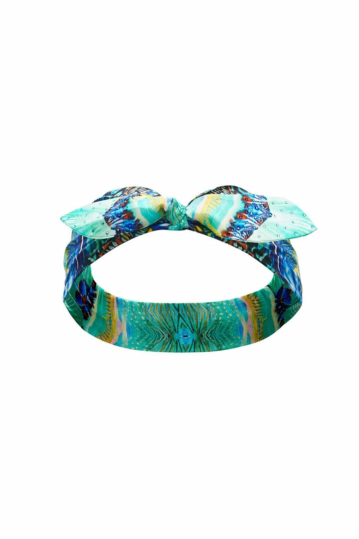 Inspired by the rainbow marine marvel that is the Great Barrier Reef, the Reef Warrior Headband with Tie is proudly boho. This knotted headband features a vibrant reef print, elasticated strap, and crystal embellishment detailing.
