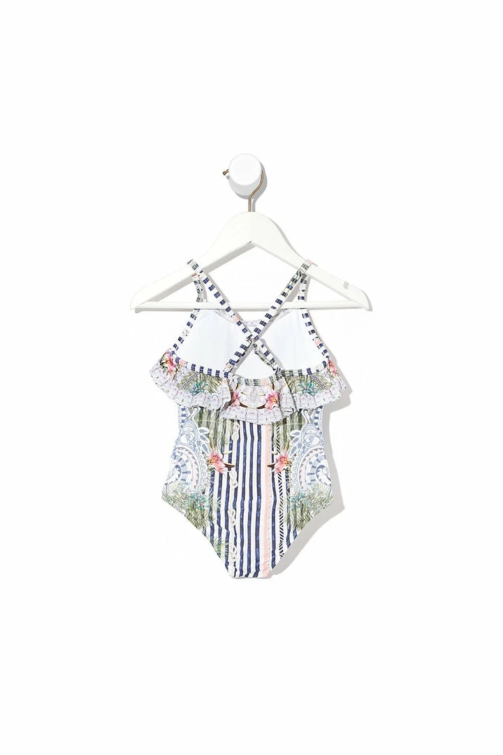 This Italian lycra printed swimsuit features a charming frill to the front and back, adjustable crossover straps, round neck and carefully scattered signature CAMILLA resin crystal embellishments.